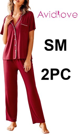 2pc women's avidlove NOTCH COLLAR BUTTON DOWN Pajama Set - SMALL - WINE RED