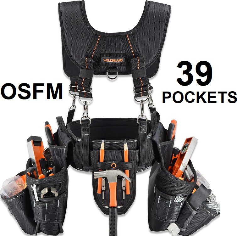 WELKINLAND 39-Pocket PADDED Tool Belt WITH SUSPENDERS - OSFM - BLACK/ORANGE (MODEL: W021040)