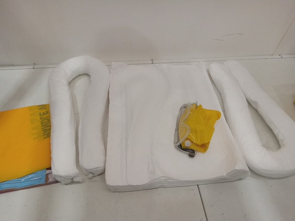 27pc OIL and FUEL Spill Kit with Oil Absorbent Pads and socks, disposable bag and gloves/goggles - Cleans up to 23L - yellow/white