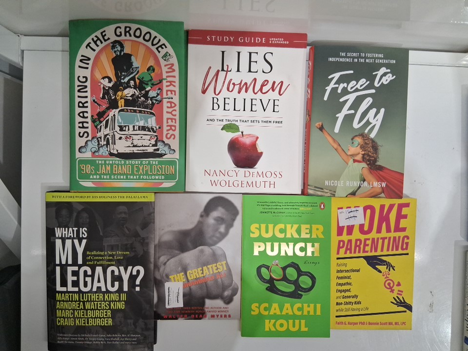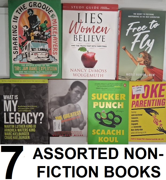 7 assorted non-fiction books - free to fly, the greatest muhammad ali, lies women believe, sharing the groove, sucker punch, woke parenting, what is my legacy martin luther king