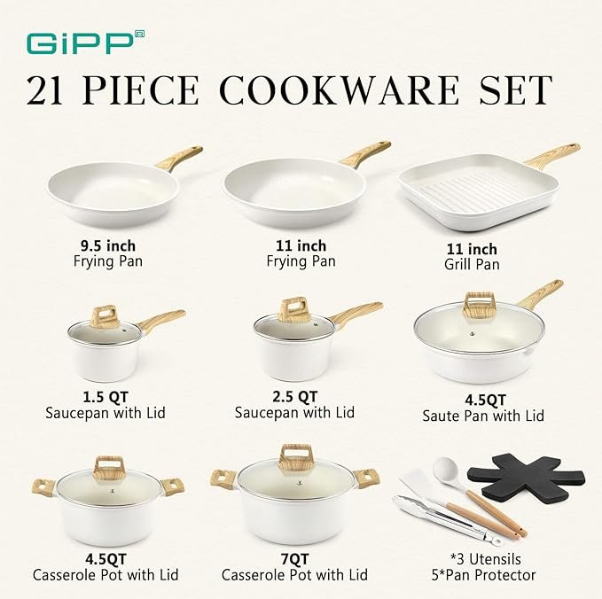 21pc gipp non stick cookware set with utensils - white (model: G21-AS2-Wh01)