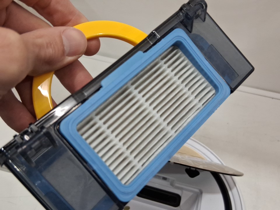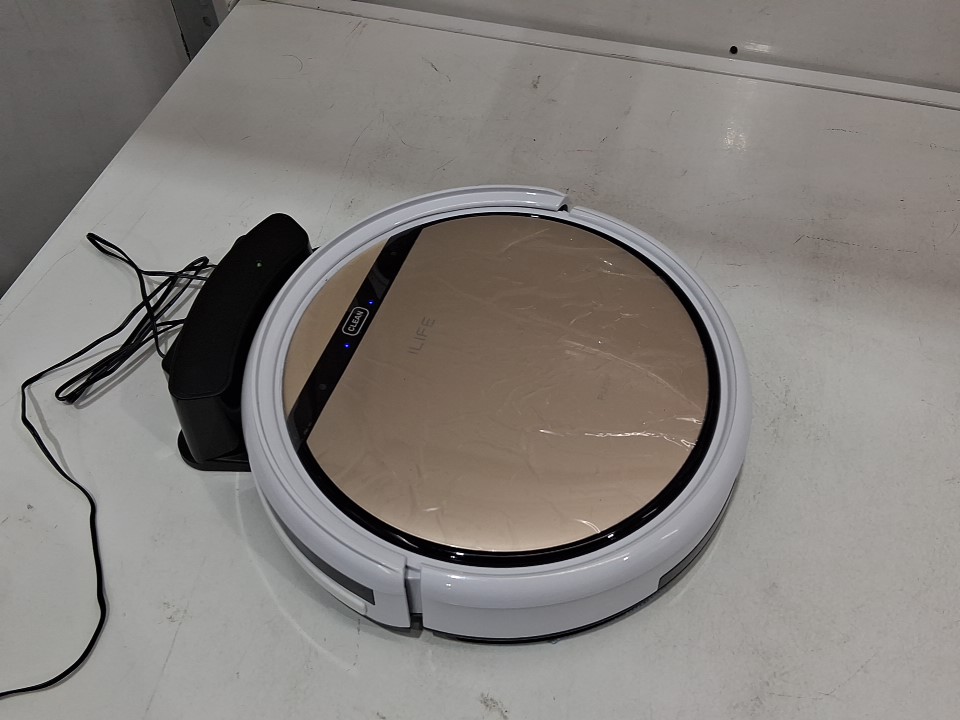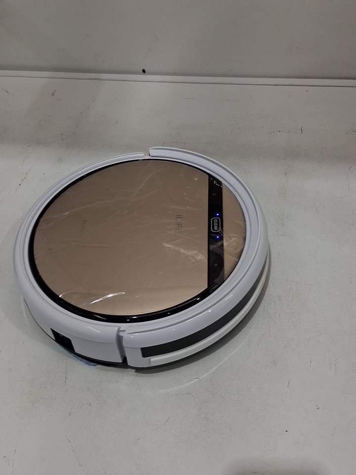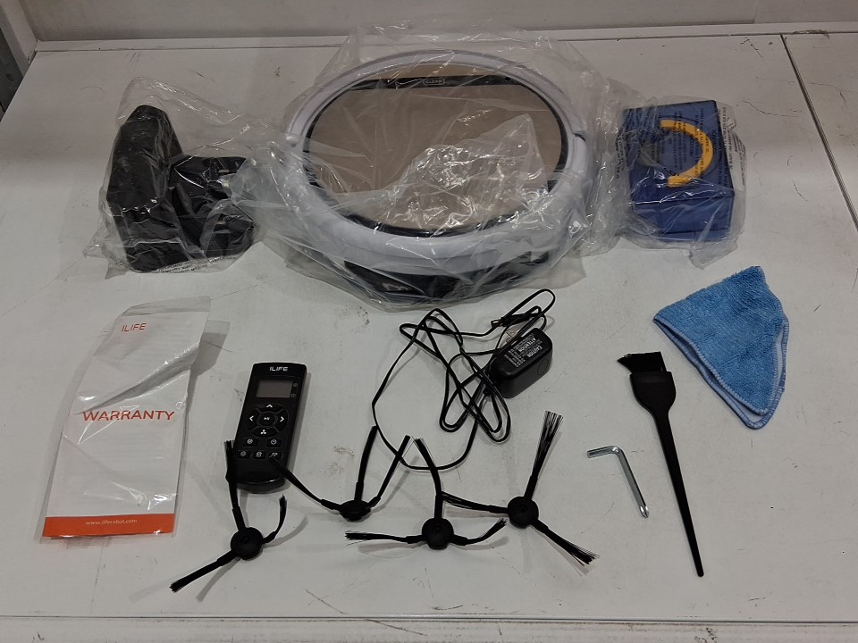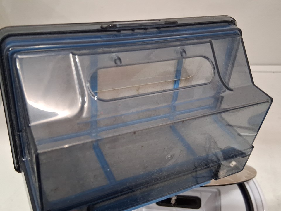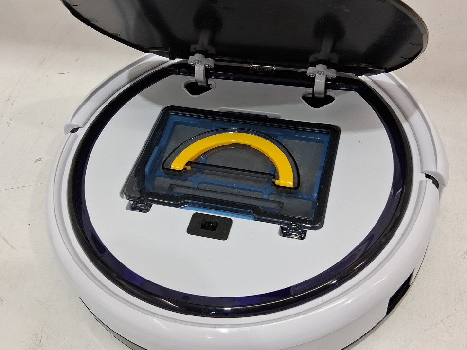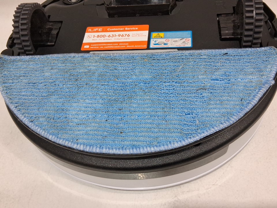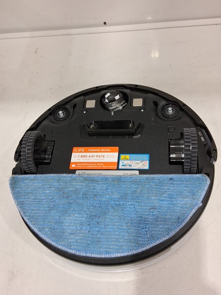 **Tested for power, movement, basic functions (spot clean/return home) using the buttons on the robot.** Item has minor dust/debris build-up in the dustbin/filter area and around the intake, light wear on the mop pad and side brushes, minor scuffs/markings along the exterior from previous gentle use, see photos.