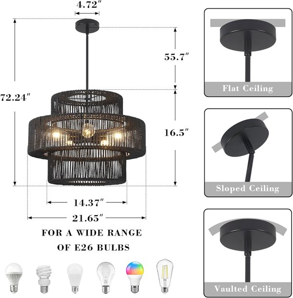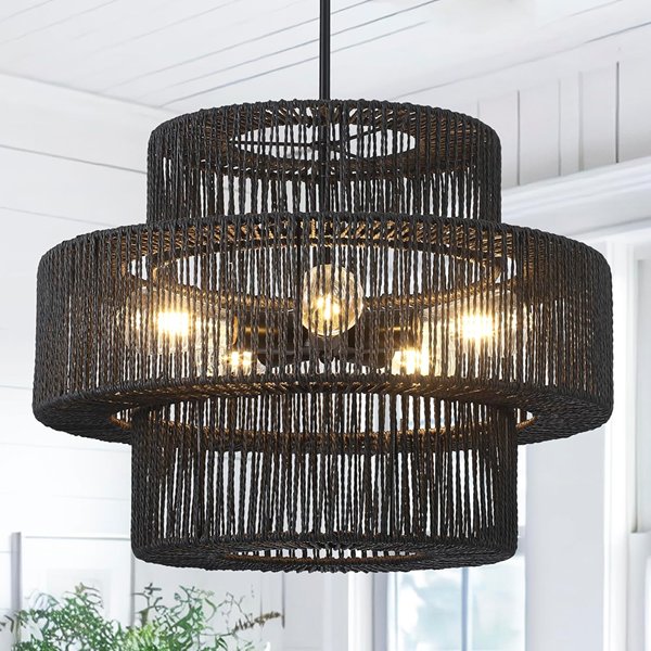 Boho Rattan Hand Woven Farmhouse Chandelier Fixture Pendant Light - 22" - BLACK