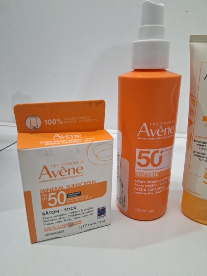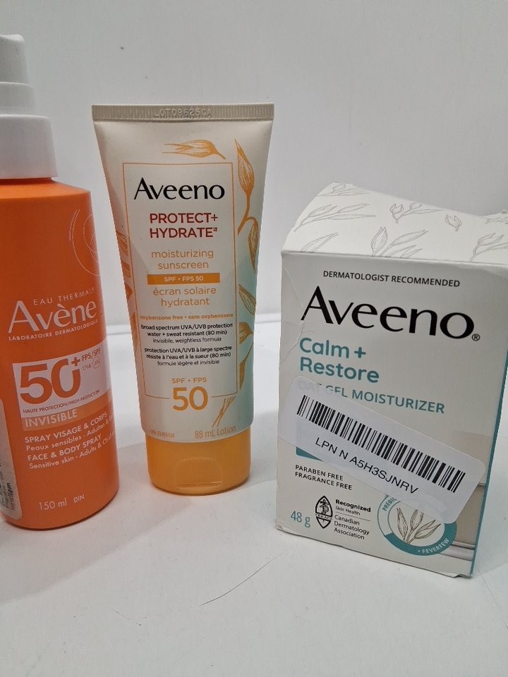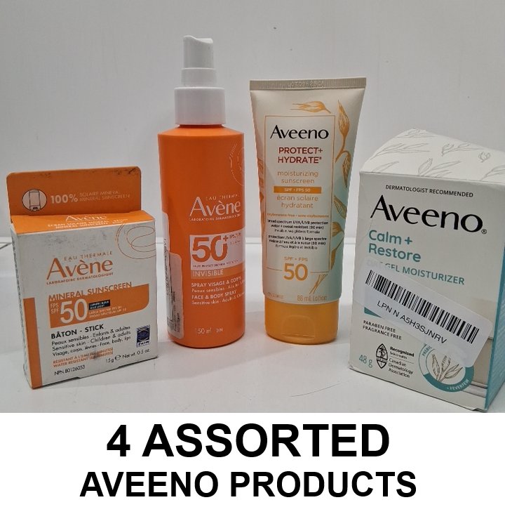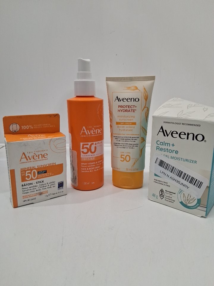 4 assorted aveeno products - sunscreen/MOISTURIZER/ sunscreen stick