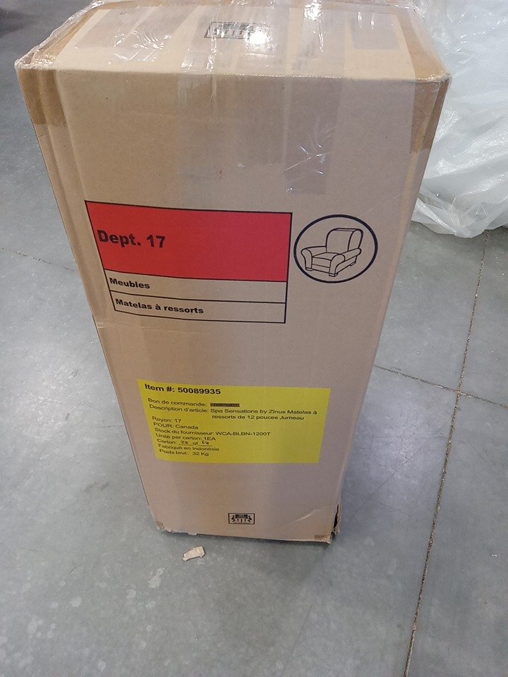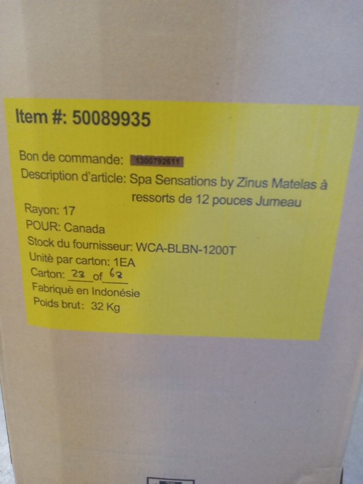 ZINUS SPA 12" SENSATIONS SUPPORT SPRING MATTRESS - TWIN (MODEL: WCA-BLBN-1200T)