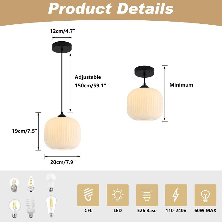 kco modern contemporary pendent light fixture - 7.5" x 66.6" x 7.9" - e26 bulb - 110v to 220v - black (model: L1150-B)