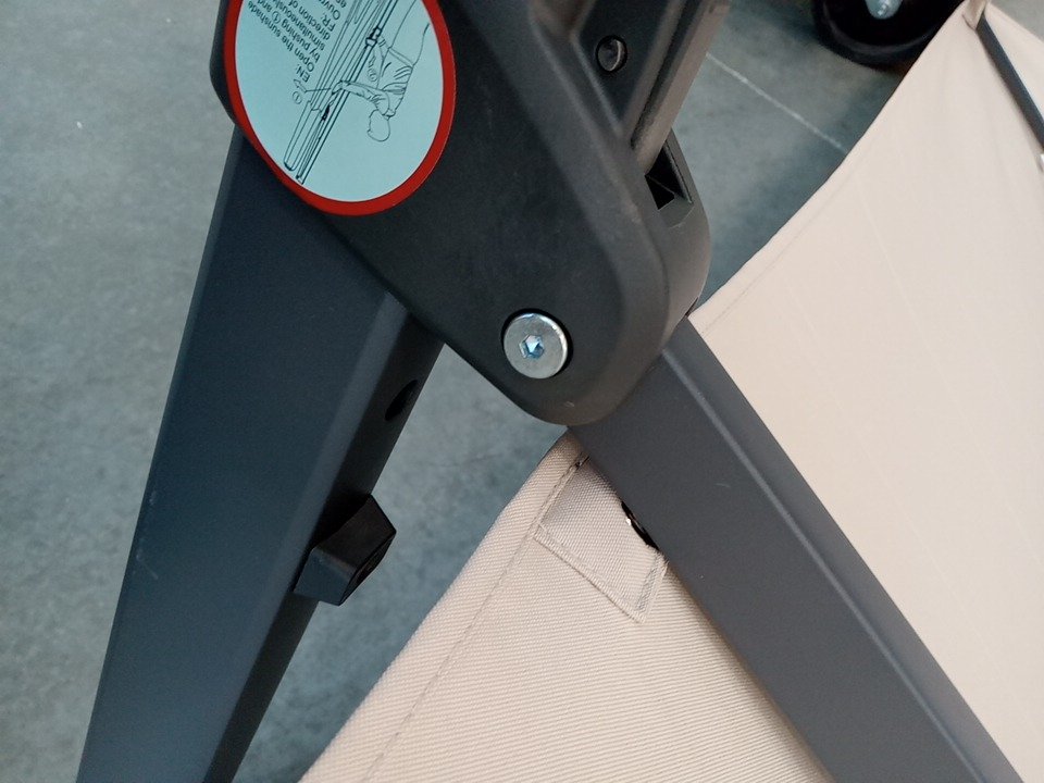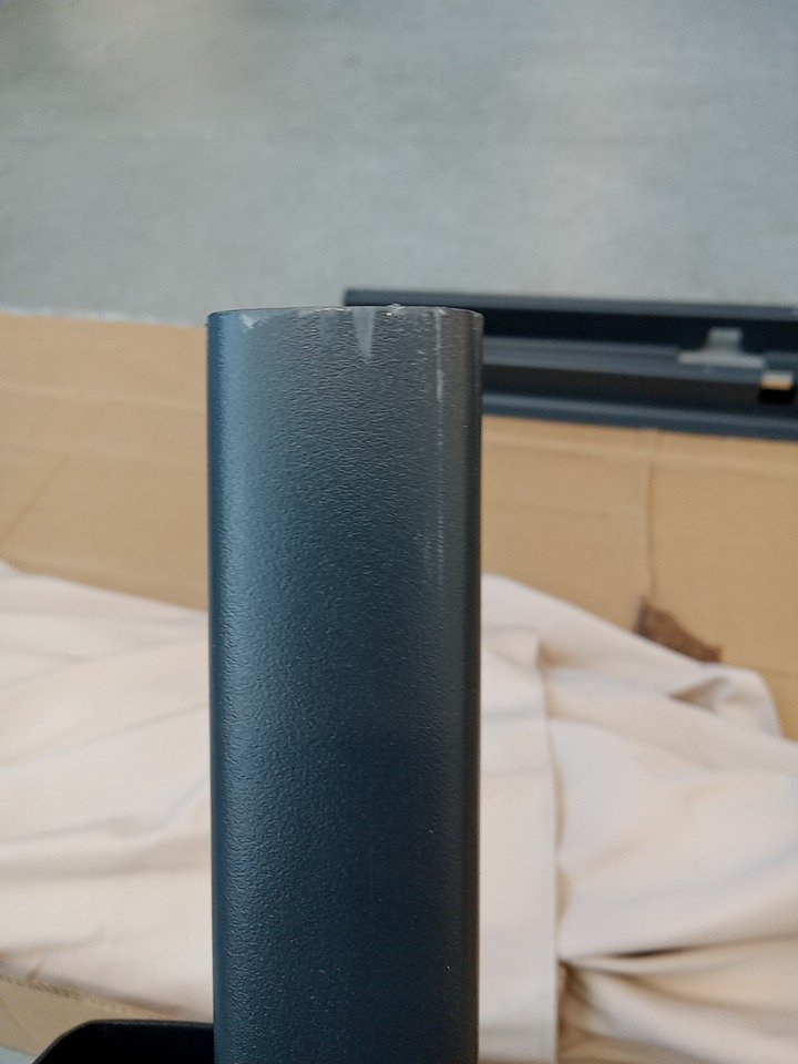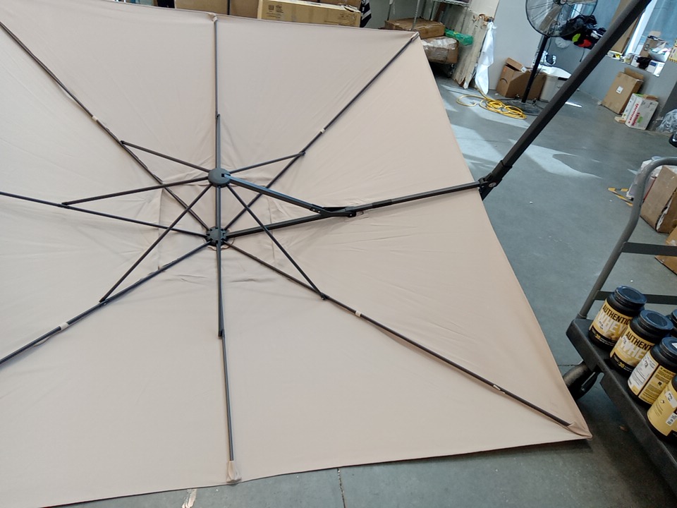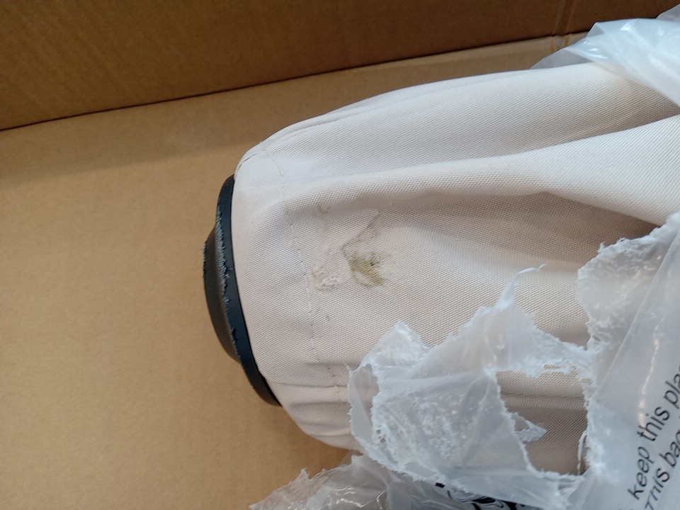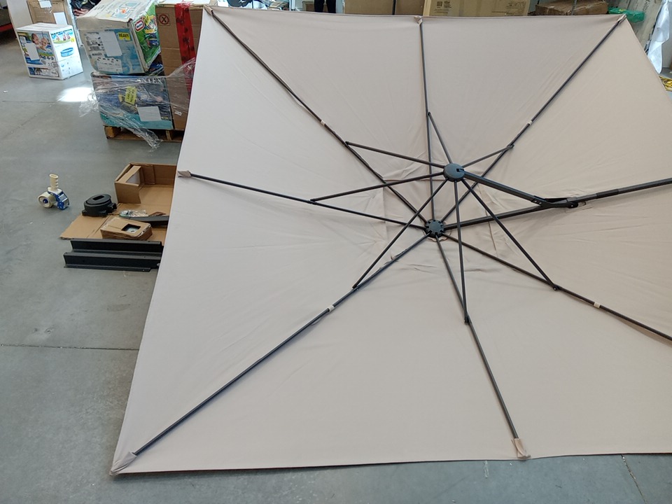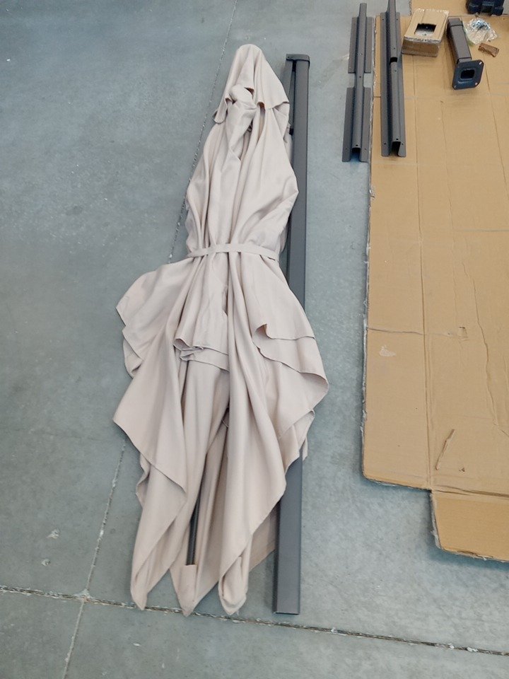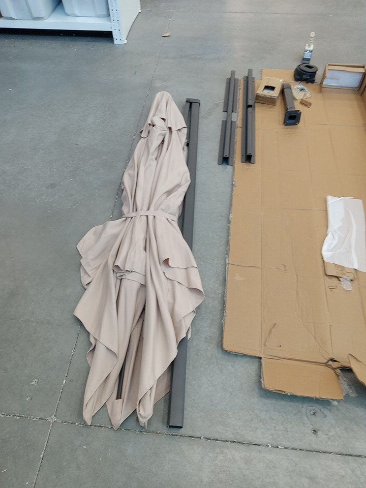 Their are some scratches, small holes and dirt present on the top of this umbrella and on the metal parts, this seems to be due to shipping and handling, all vital parts for assembly are present. see photos below.