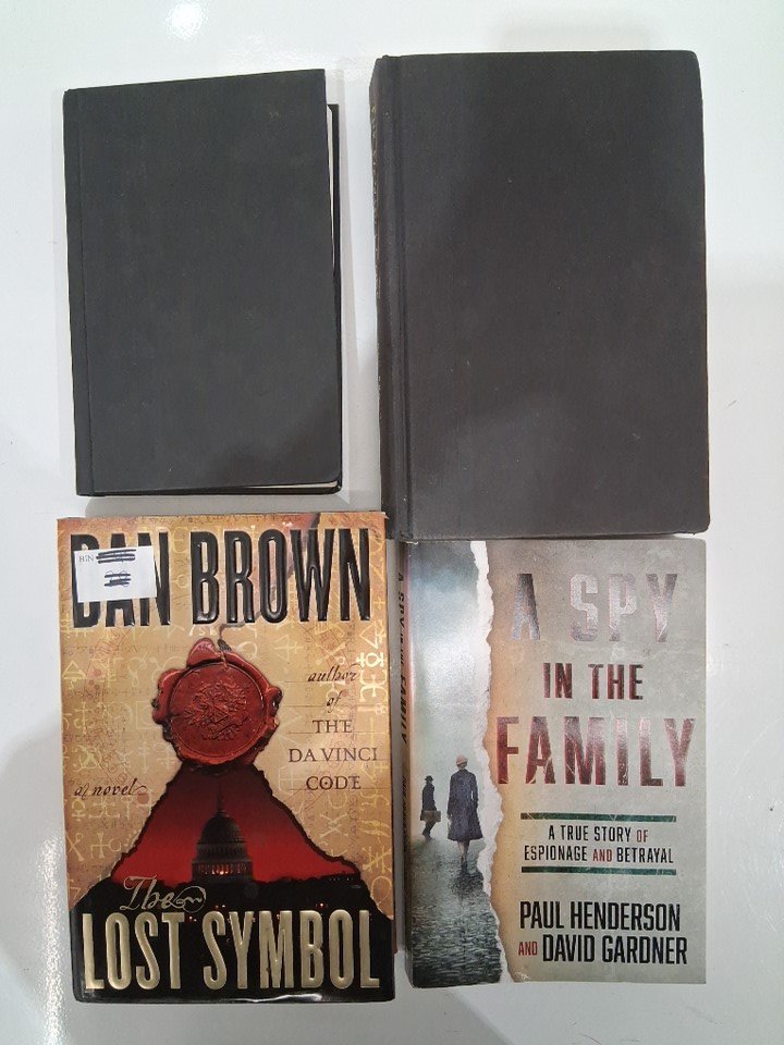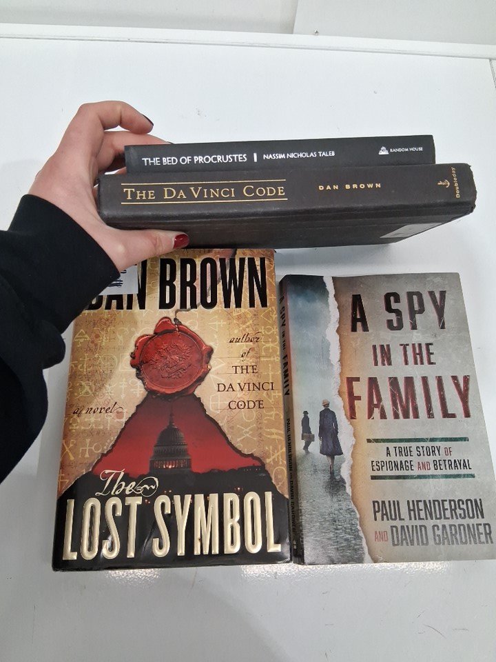 4 ASSORTED fiction books - the bed of prophets, the da vinci code, the lost symbol, a spy in the family