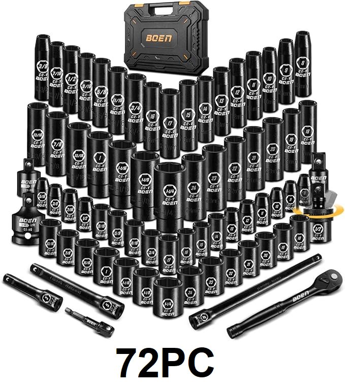 72pc boen 1/2" impact socket set with sae and metric bits - 5/16" to 1 1/4" sae - 8mm to 24mm metric - black