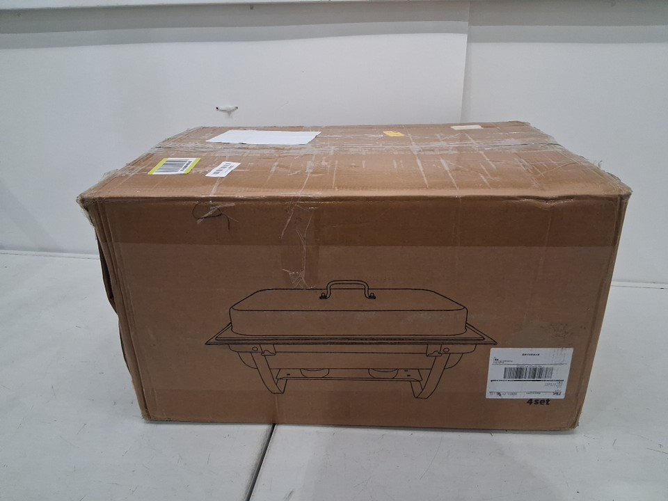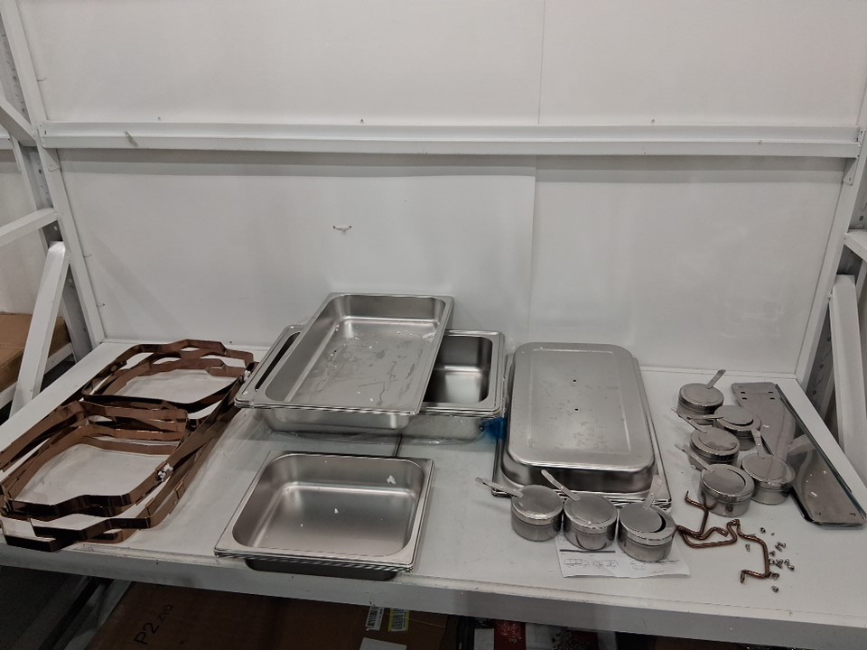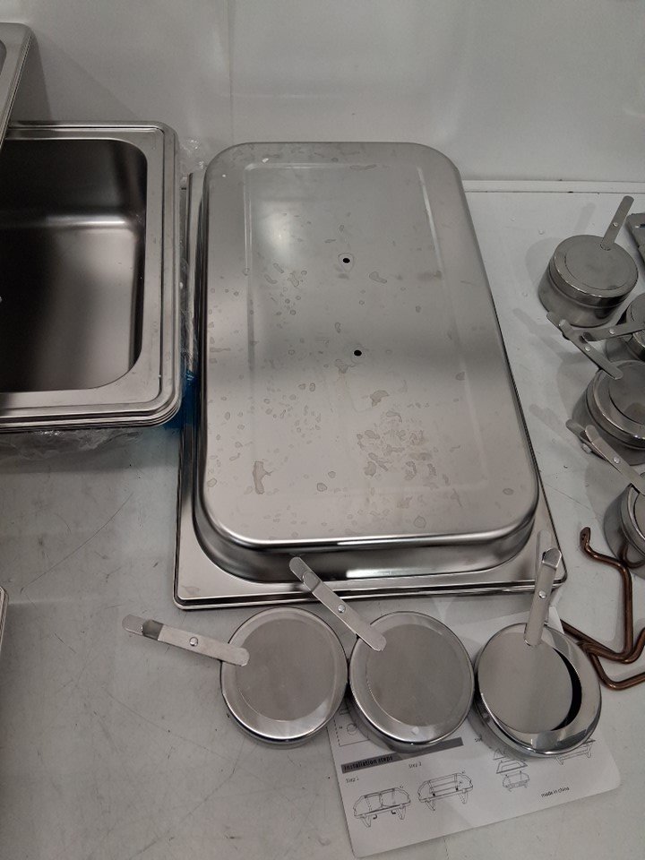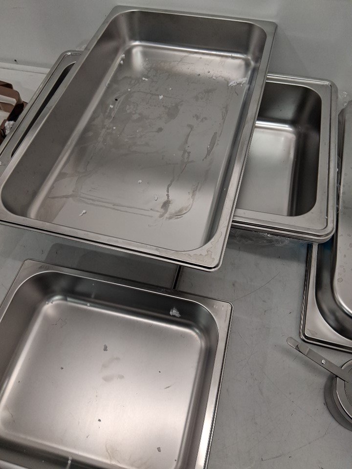 Chafing dishes have visible signs of use. All pans and lids have water spots on them, lids have blemishes from handles being installed, one base frame , has come off from wielding spot. Hardware was loose and some maybe be missing