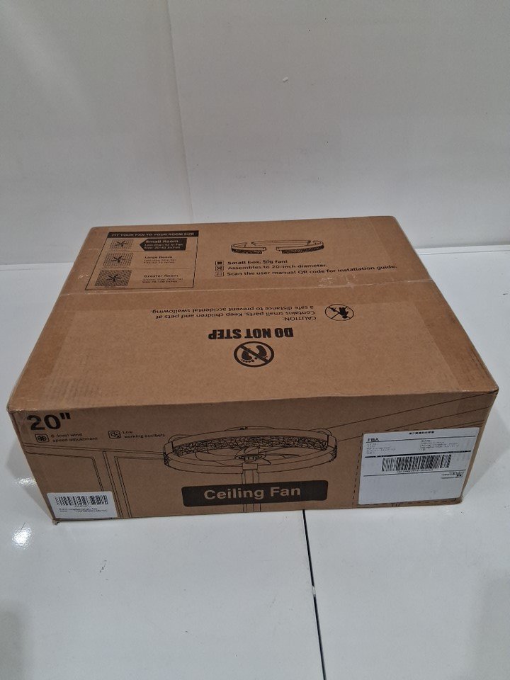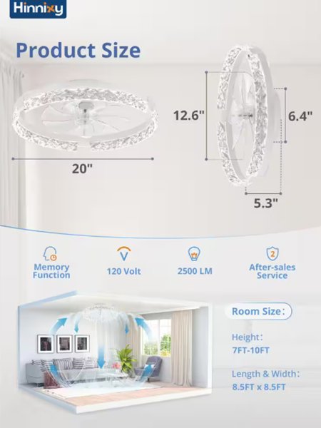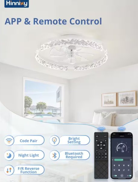 HINNIXY Smart Indoor White Crystal Ceiling Fan with Integrated LED Light and Remote App Control - 20" - 20W 2500LM 3000-6000K - WHITE (MODEL: Y25FSD0020-2801AC)