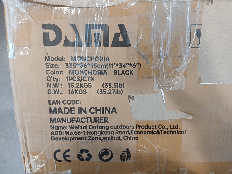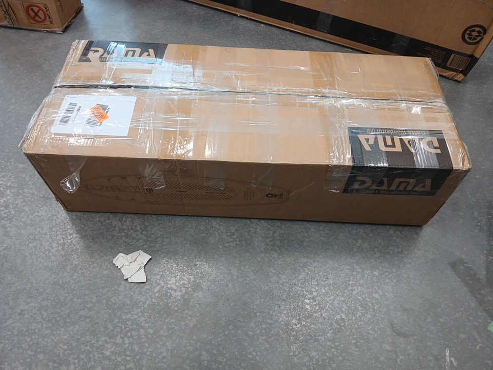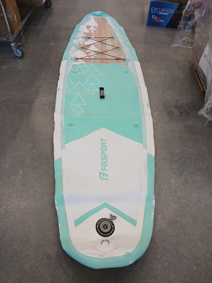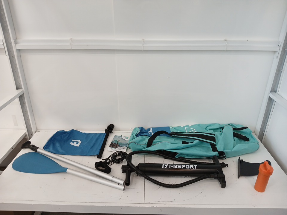 the paddle board has signs of previous use with some dirt scuffs on the top, the bag and some wear on the pump.