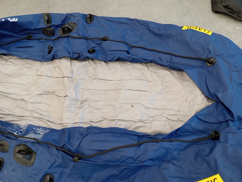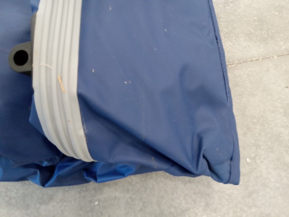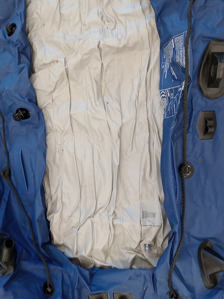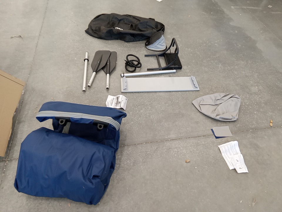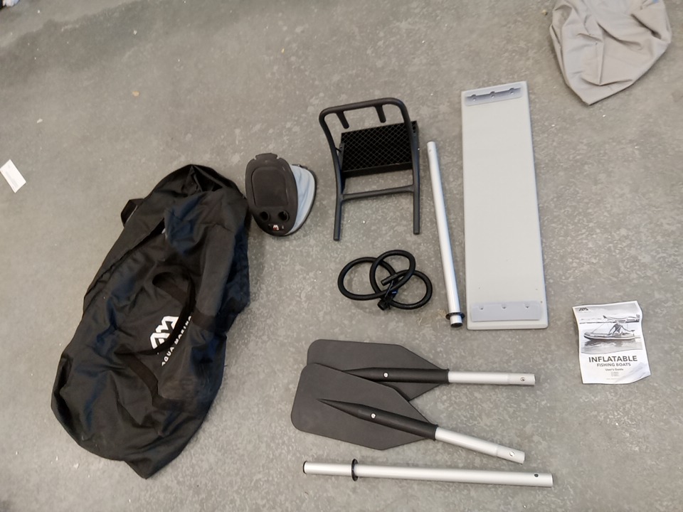 we have found a heavy amount of dirt on this item as well as a outdoor / dirt odor, this is due to previous heavy use, this item does not include a electric pump meaning we were unable to test the item to see if its capable to hold air, however despite the heavy dirt on this item their is no indicators that it would have issues with holding air ( meaning their were no cut or tears found on this item). their are some cuts and tears on the storage bag however. this item is also missing the awning / sun shade cover accessory that is seen on the manual, however this item does included accessories such as 2 oars, seat and motor mount. see photos below.