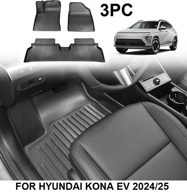 3pc BestEvMod All Weather 1st & 2nd Rows Set Floor Mats Compatible with Hyundai KONA EV Electric 2024 /2025 - black - (model:BE-KN-FM)