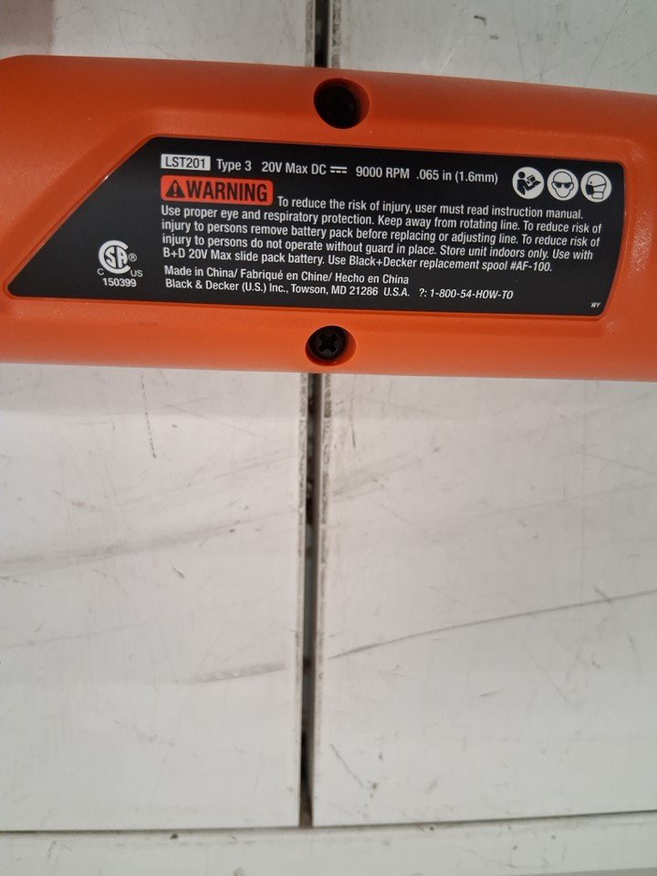 BLACK AND DECKER CORDLESS STRING TRIMMER/EDGER WITH BATTERY CHARGER *TOOL ONLY* - 10" - 20V MAX - BLACK/ORANGE (MODEL: LST201)