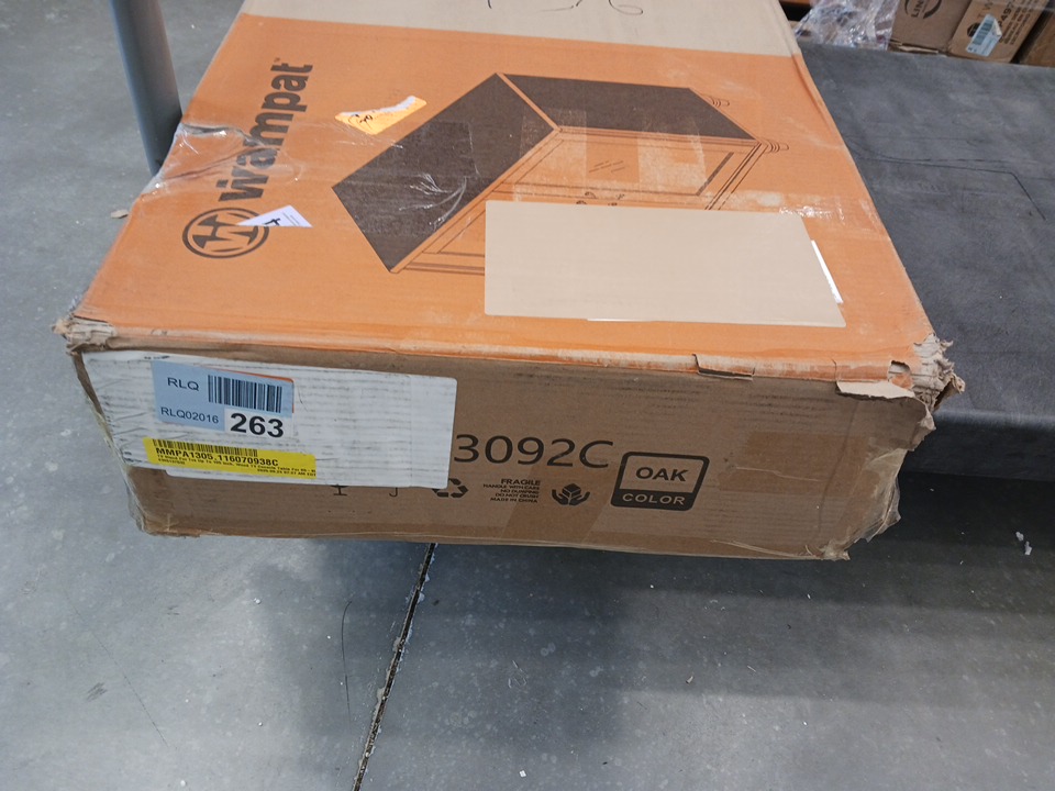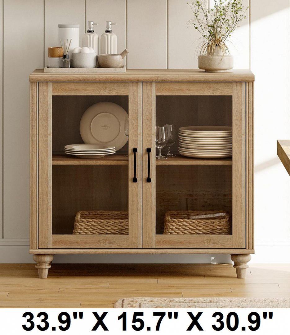 WAMPAT Oak Sideboard Buffet Cabinet with Tempered Glass Door, Adjustable Interior Shelves, Soft-Close Hinges, Cable Management Cutouts and Metal Hardware Handles - Oak Brown (Model: W01F3092C)