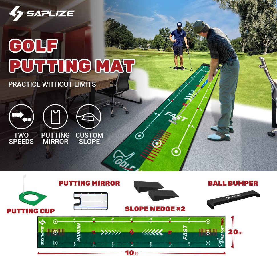SAPLIZE TWO-SPEED GOLF PUTTING PRACTICE MAT WITH PUTTING ALIGNMENT MIRROR - 20" x 10FT - GREEN - (MODEL: ‎JYG2-TL02S-GRDS@#A05)