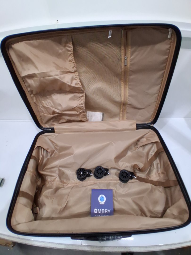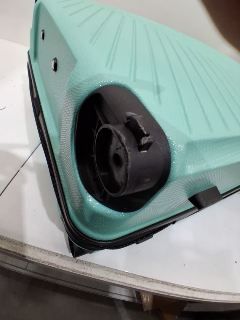 Item has mild distress on outer shell. Item is missing one wheel, can be replaced through manufacturer or online retailers.
