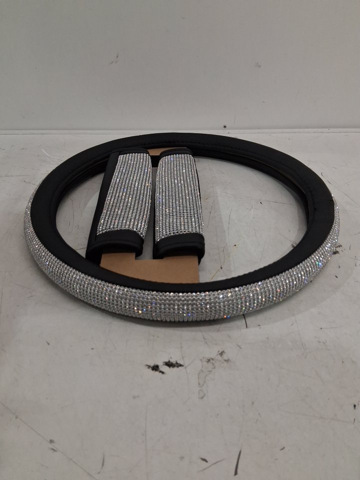 3PC Amazon Basics Leather Diamond Steering Wheel Seat Belt Cover Set - Black