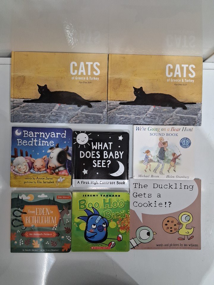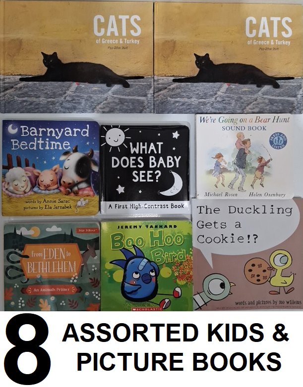 8 ASSORTED KIDS illustrated children's books and picture books - (2) cats of greece & turkey, barnyard bedtime, what does baby see, we're going on a bear hunt, from eden to bethleham, boo hoo bird, the duckling gets a cookie!?