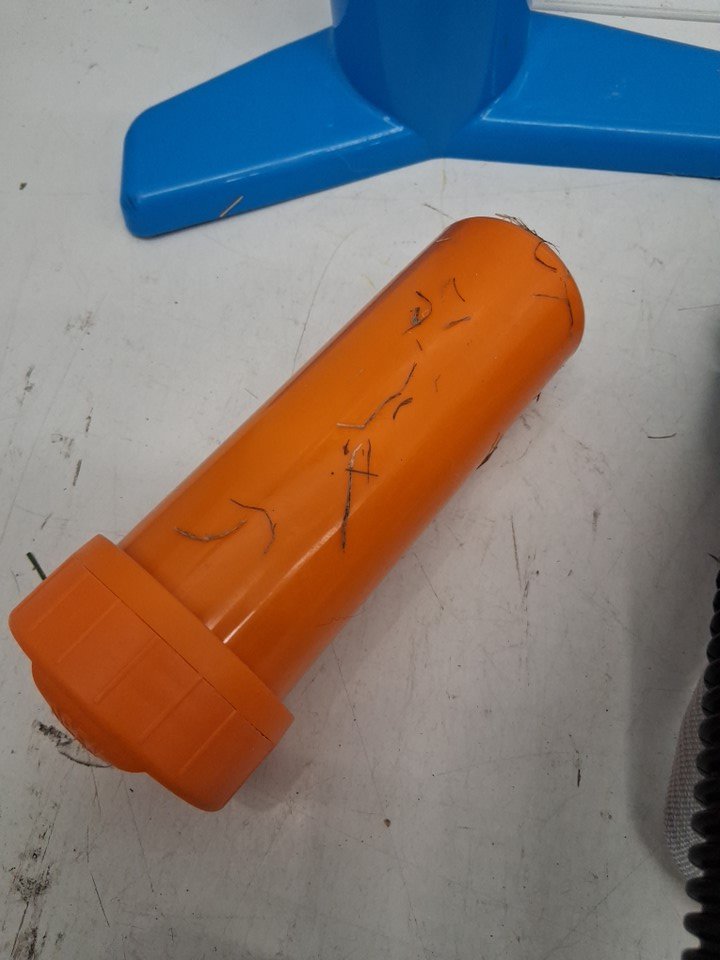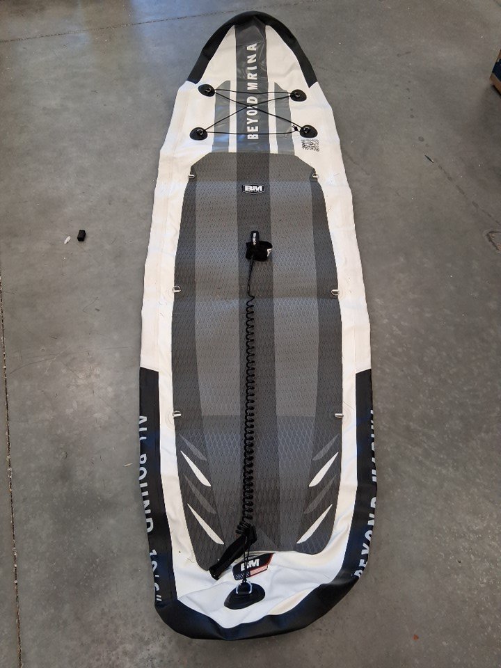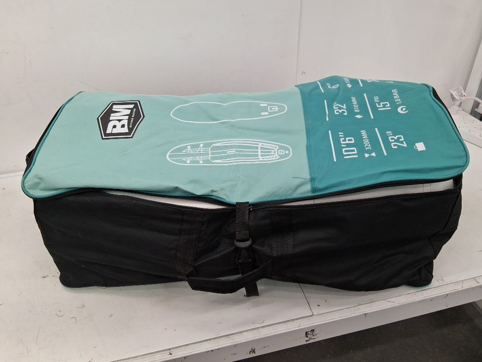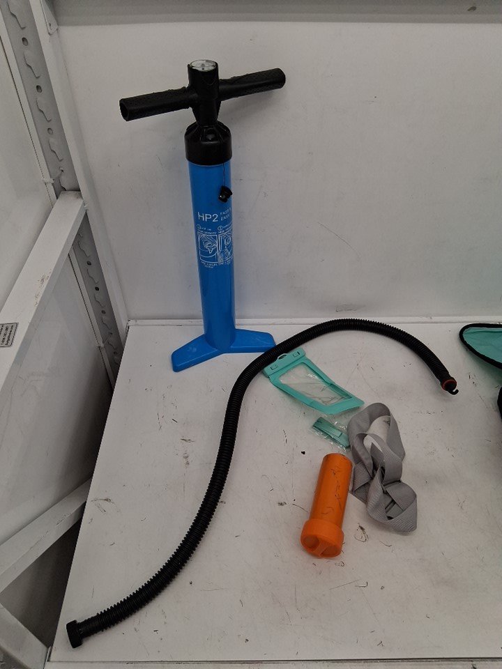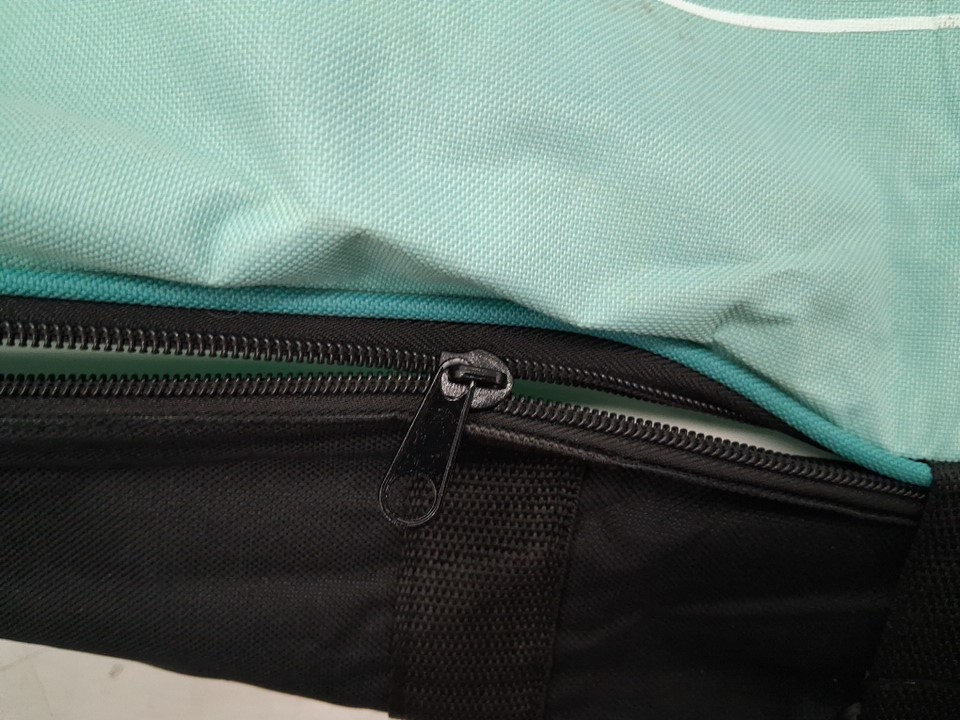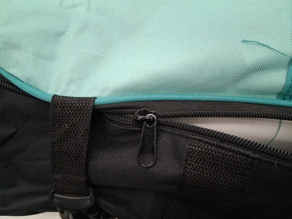 The zippers on the carrying bag appear to be broken or out of line, will not actually zip shut when pulled. Additionally, there is a presence of dirt and grass on the board and accessories, indicating some previous use - see photos. Other than the cleanliness and zipper issue, all parts appear present and in good condition.