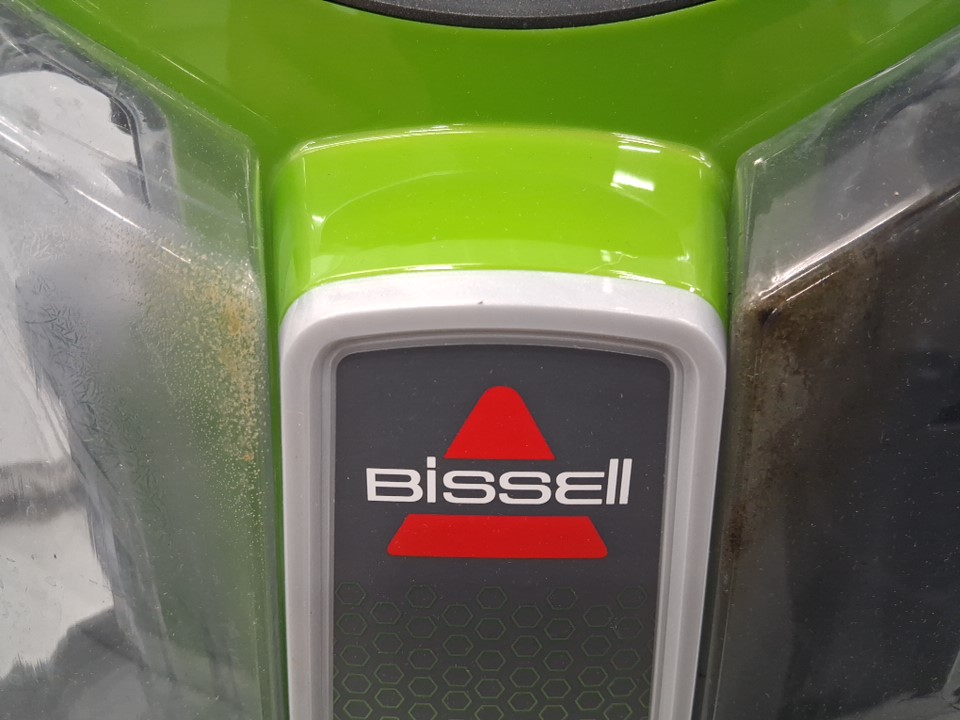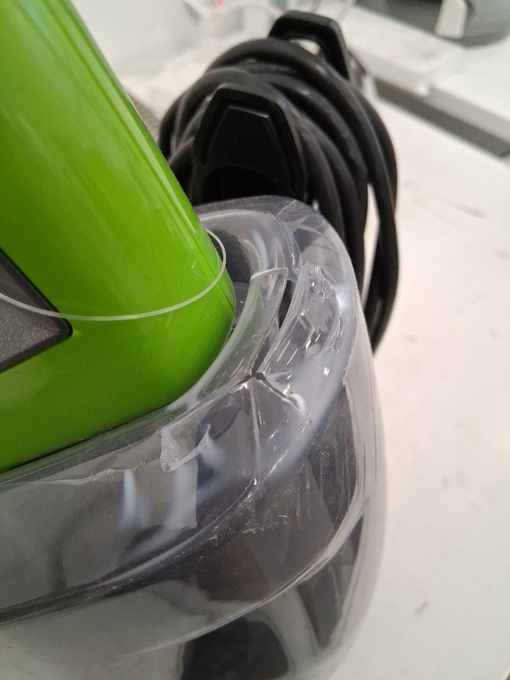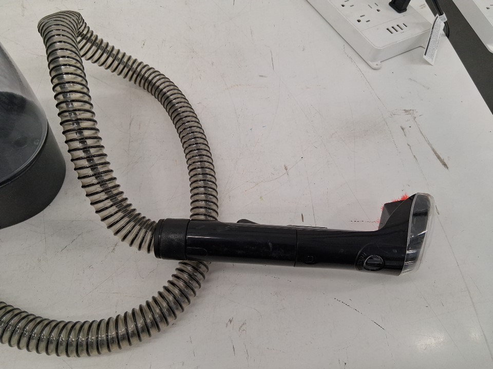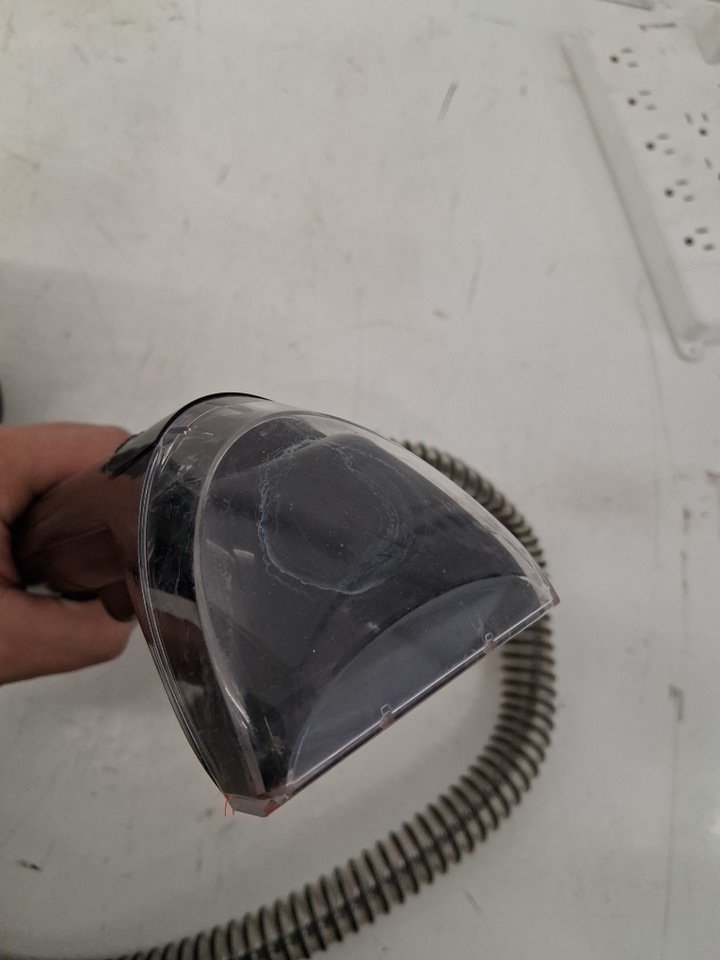 There is a crack in the top of the right side tank, and the plastic hose is bent out of shape in one area. Additionally, there are dirt and water stains on the exterior, inside the tanks, and on the brush head indicating previous use - see photos. Outside of these issues, appears to power on and function as normal.