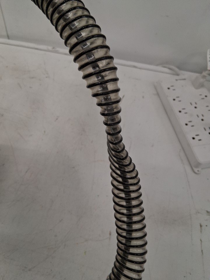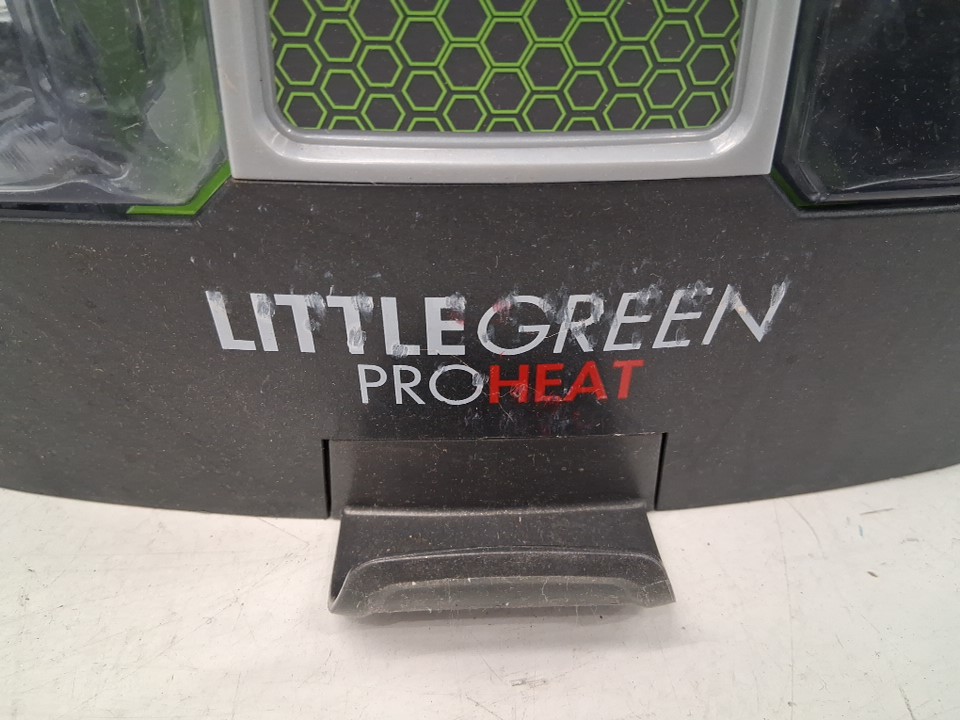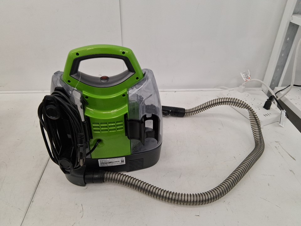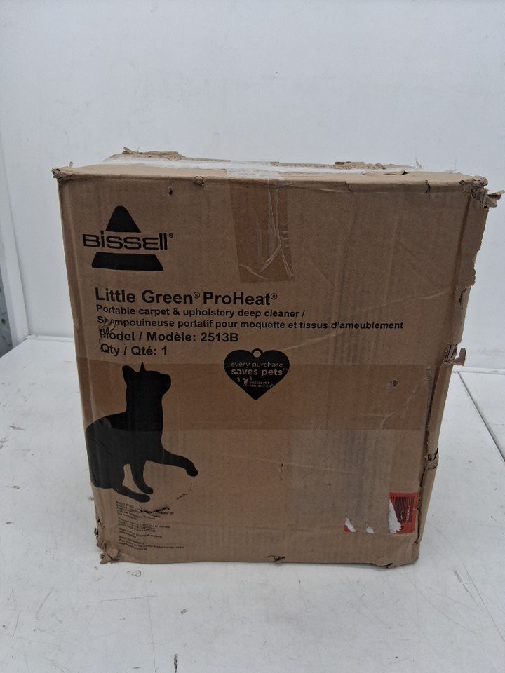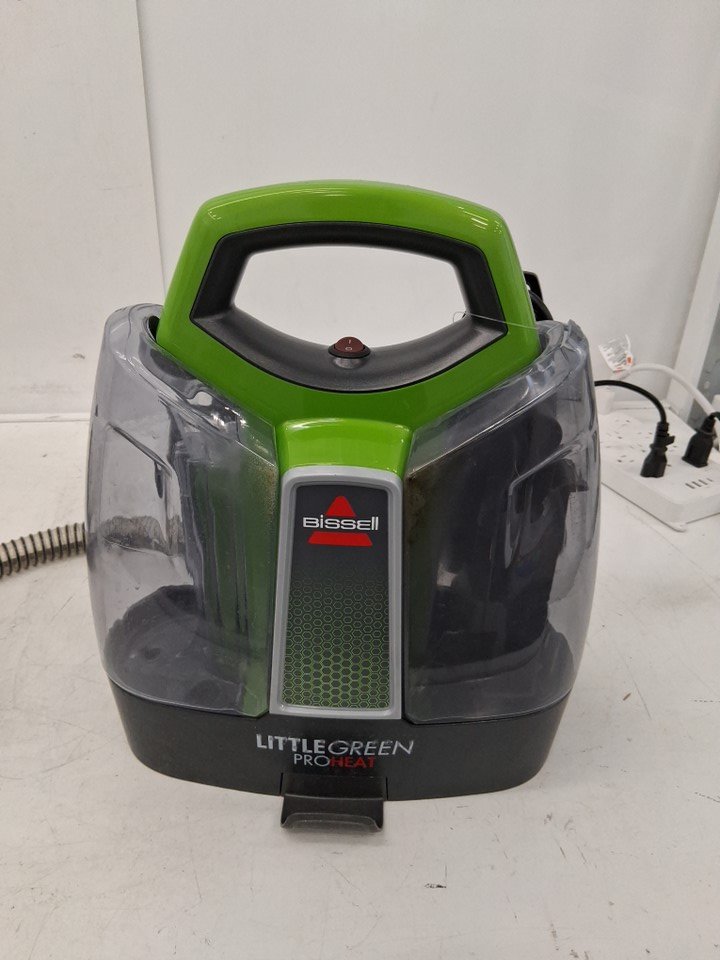 There is a crack in the top of the right side tank, and the plastic hose is bent out of shape in one area. Additionally, there are dirt and water stains on the exterior, inside the tanks, and on the brush head indicating previous use - see photos. Outside of these issues, appears to power on and function as normal.