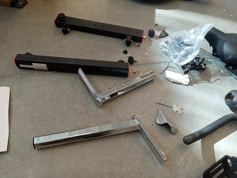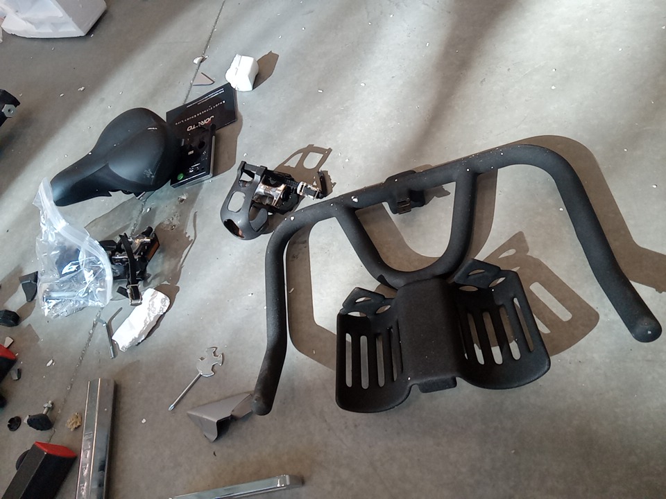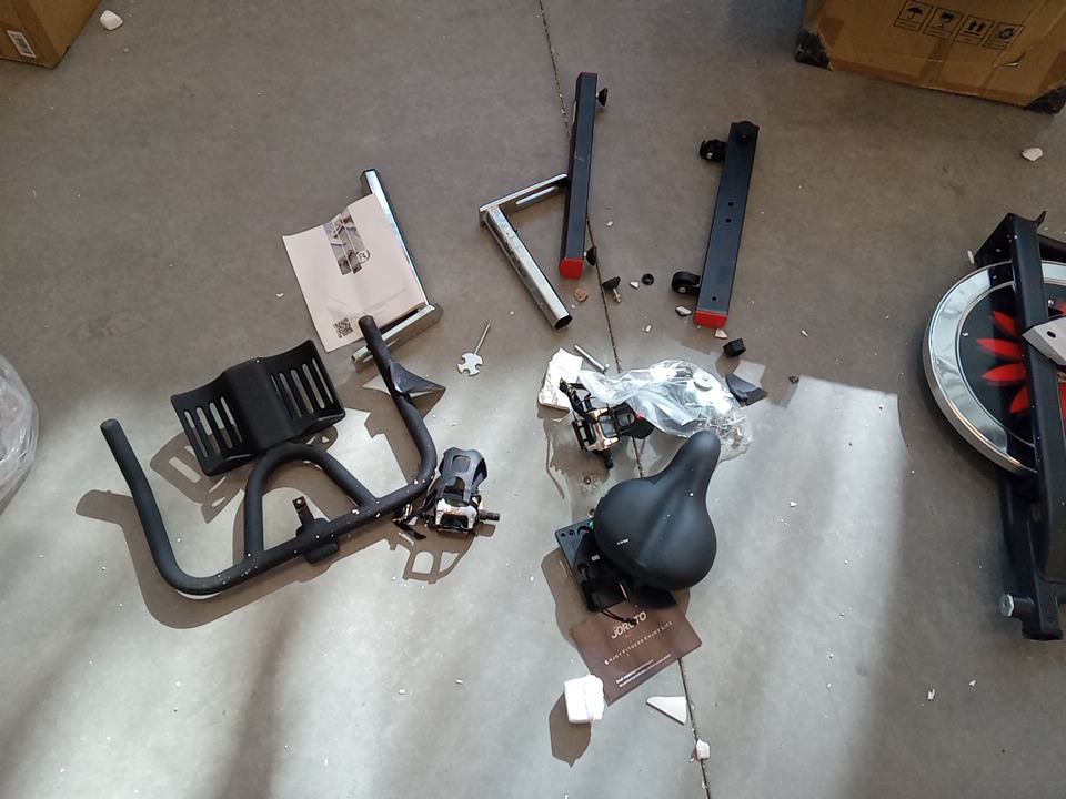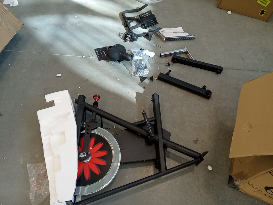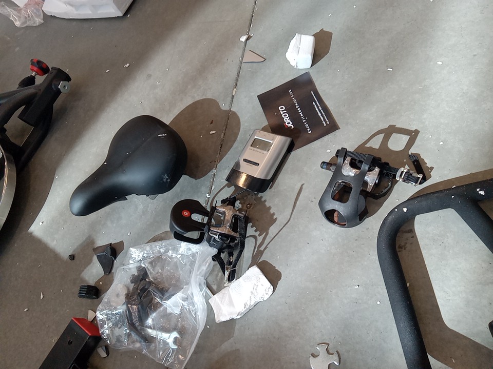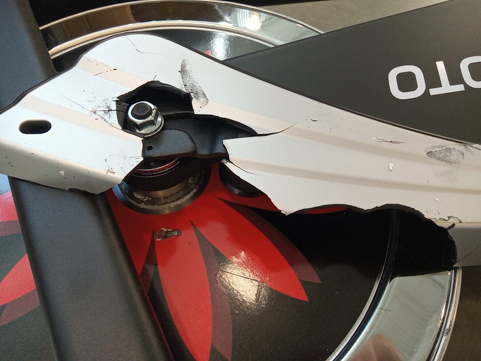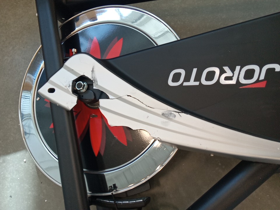 their are some broken / cracked plastic pieces as well as fraying on the material of the wheels, this could be dangerous as it exposes parts that move when this item is in use that would otherwise be covered, your hand could get caught in the moving pieces due to it being unposed, we recommend the user covers up these exposed spots for safety. all parts for usage are present. their are general scuffs and blemishes on this item from shipping and handling.