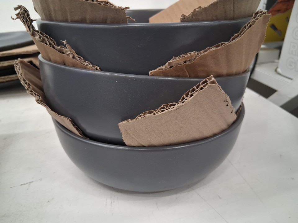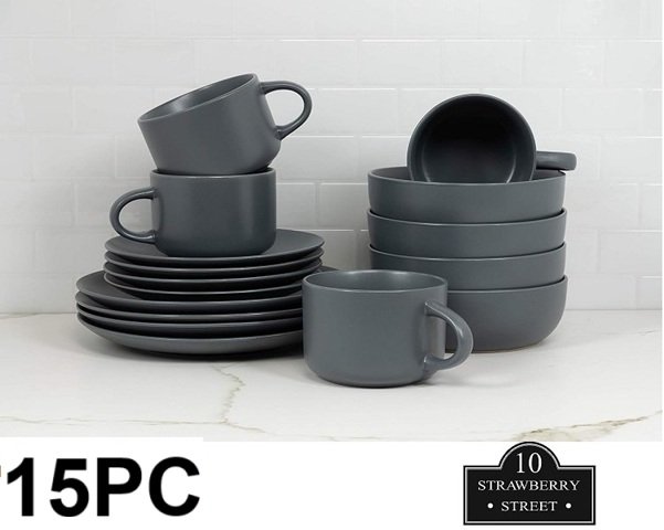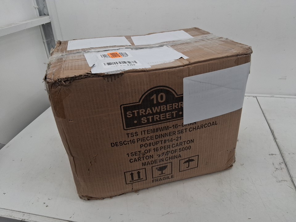 Retails as a 16 piece set, but one of the bowls is missing from the packaging, bringing the total items to 4 each of small plates, large plates, and mugs, and 3 bowls - see photos.