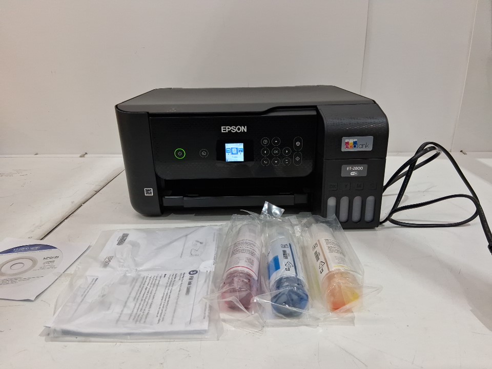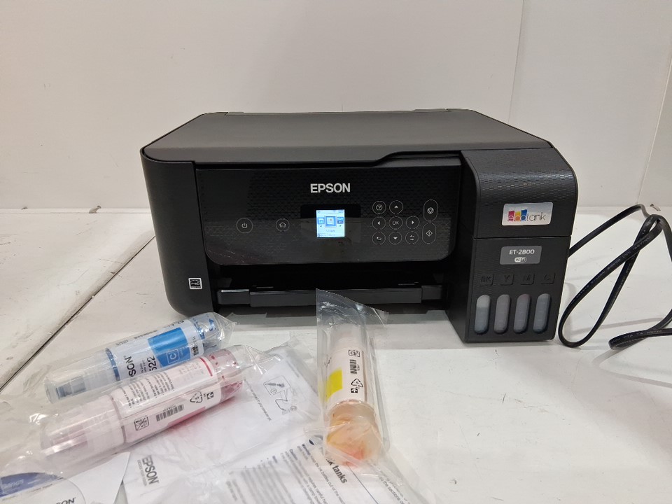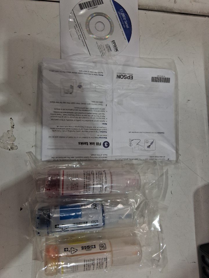 Item tested for power. Item has some ink stains inside the box and three empty used ink cartridges. (See photos)