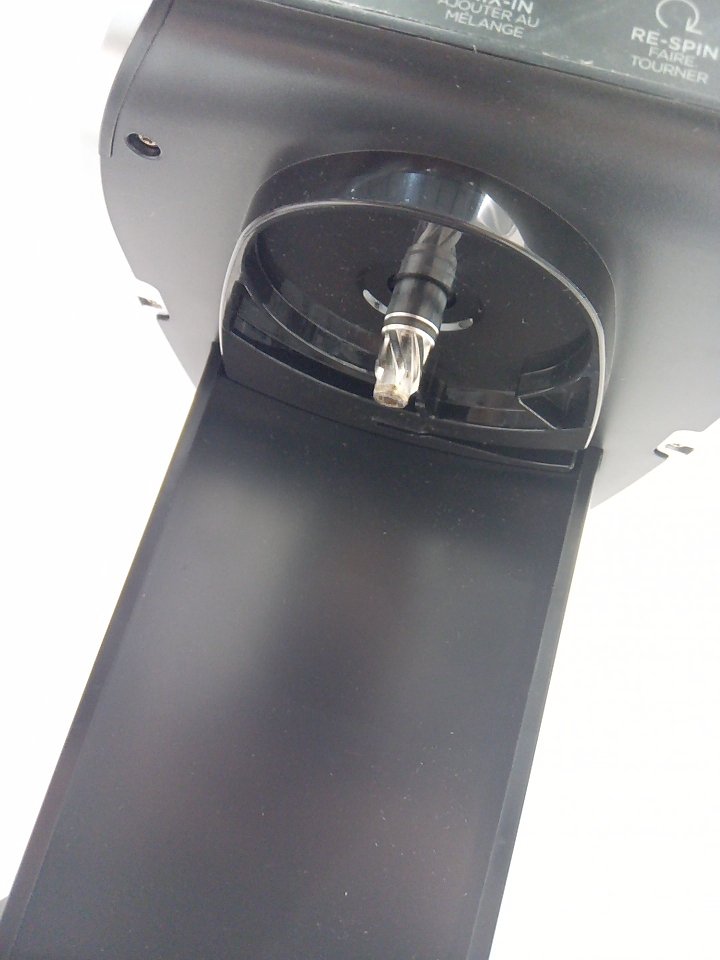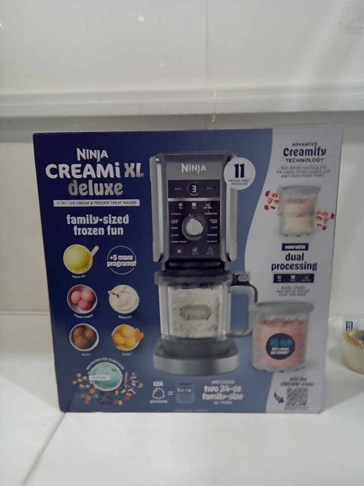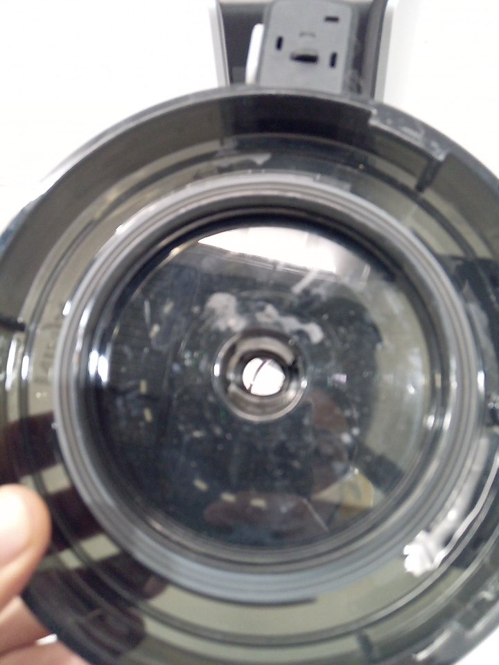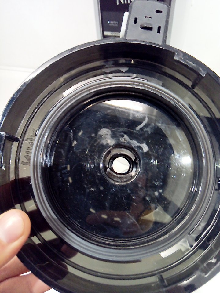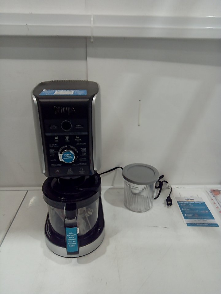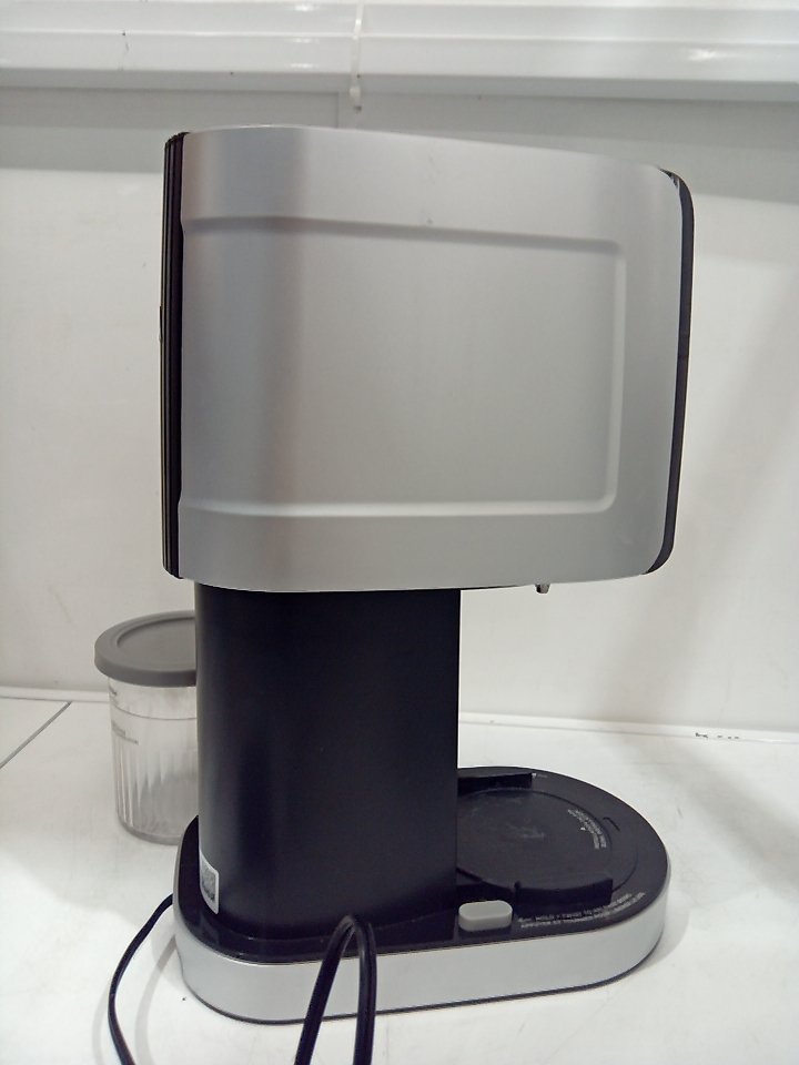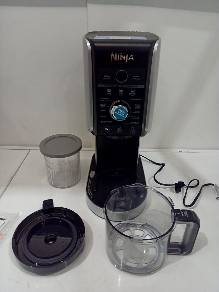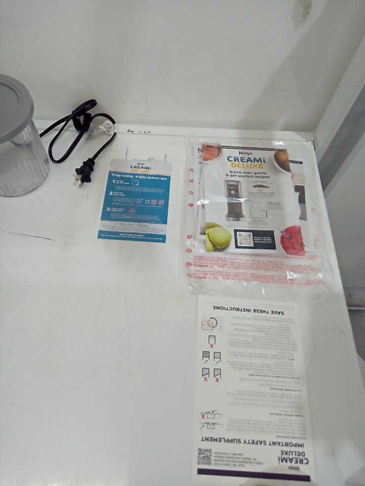 There are scratches, light markings and food residue on the sides of the machine and the mixing cup. Ours is missing one storage cup and the paddle/blade and there are some markings on the piece where the paddle attaches. Tested for power only. (SEE PHOTOS)