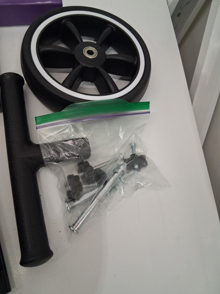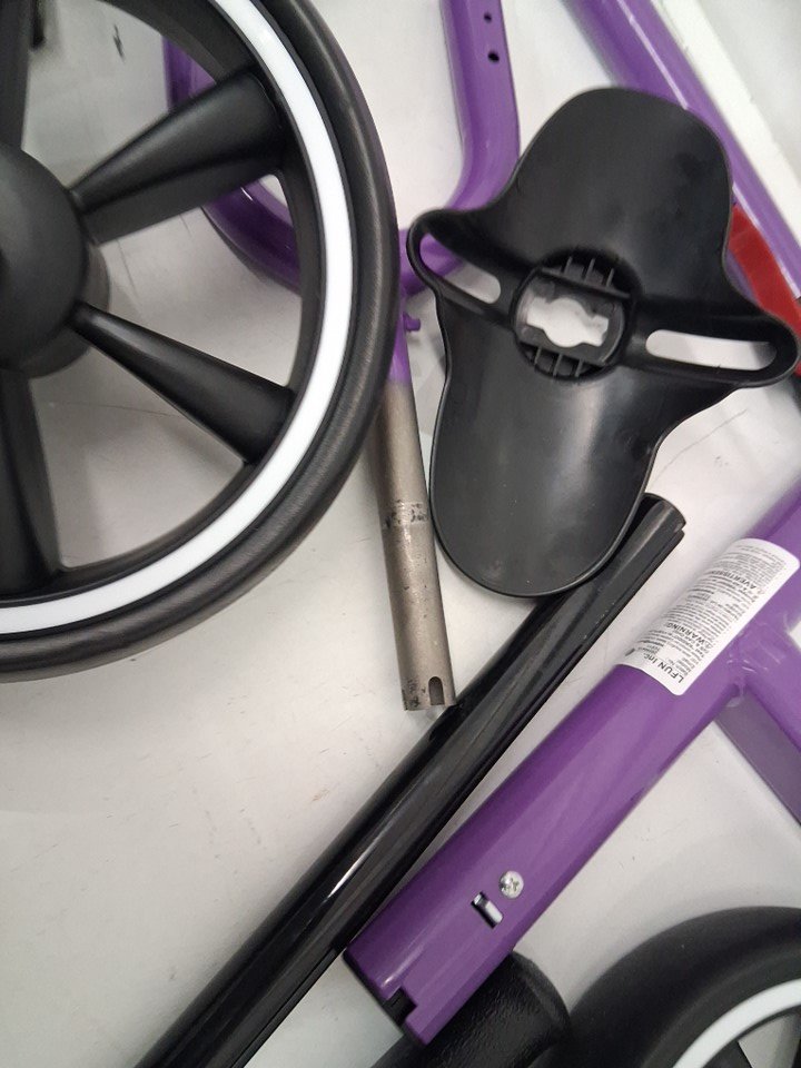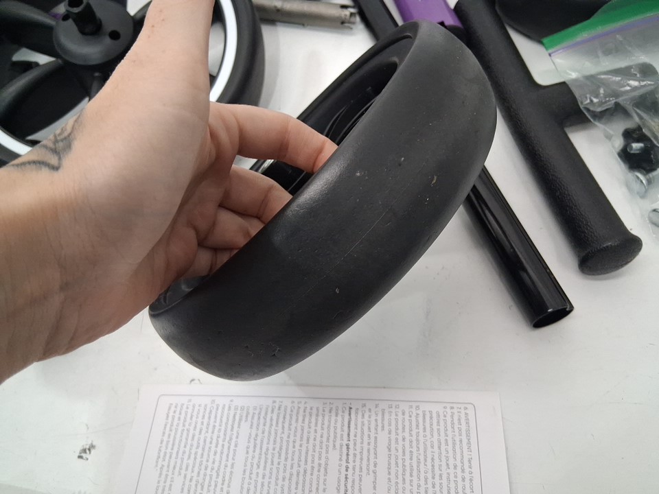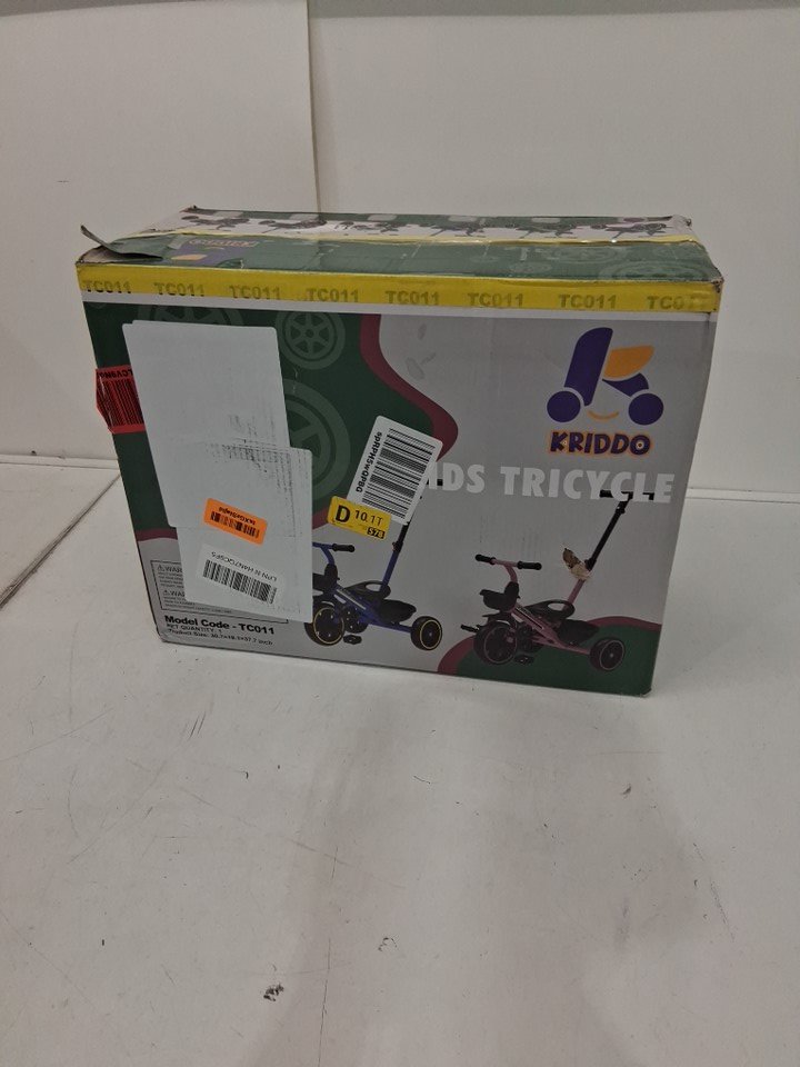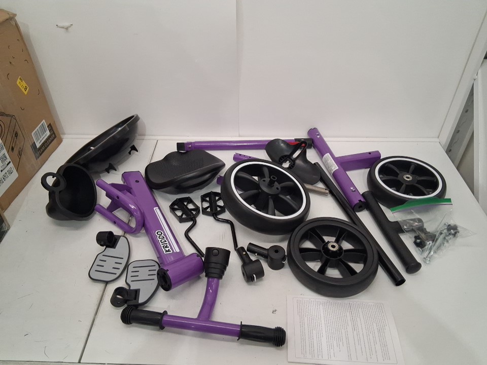 Tricycle has blemishes/scuffing from previous assembly, tires have dirt discoloration and hardware is in ziploc bag
