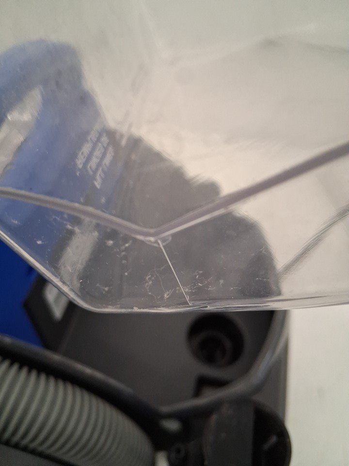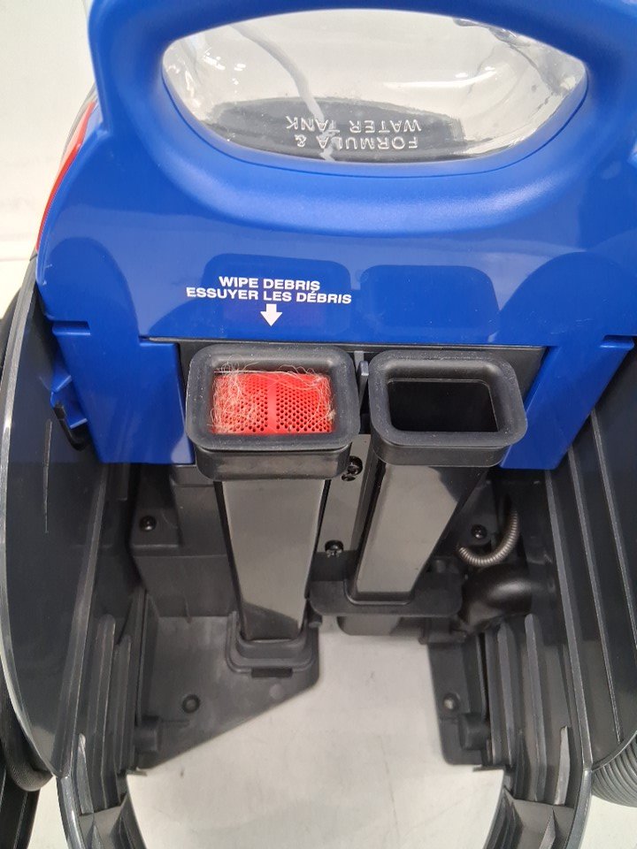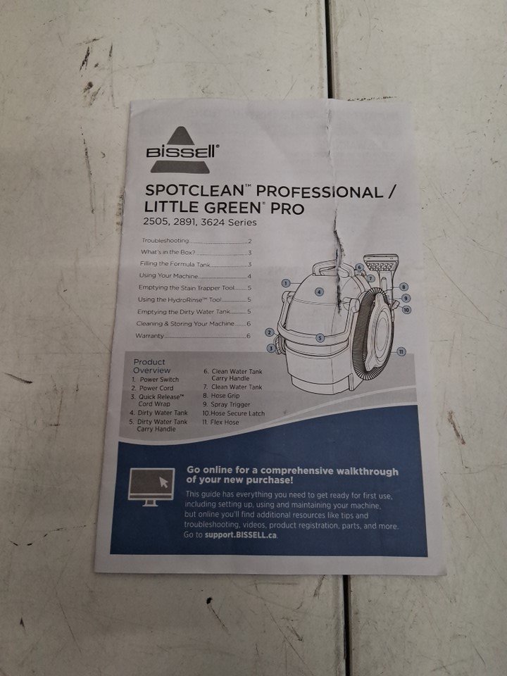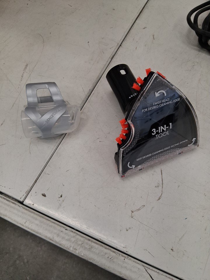 The regular vacuum head and the bottle of cleaning product are missing from the packaging. Additionally, is some light dirt and debris in the vacuum tank and on the end of the hose, and some dried water residue in the water tank indicating some previous use - see photos. Aside from the missing parts, appears to be in good condition and function without issue.