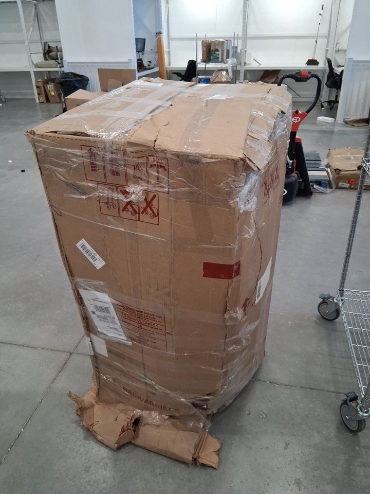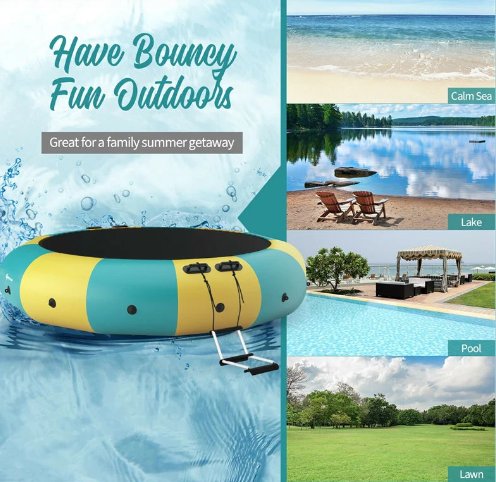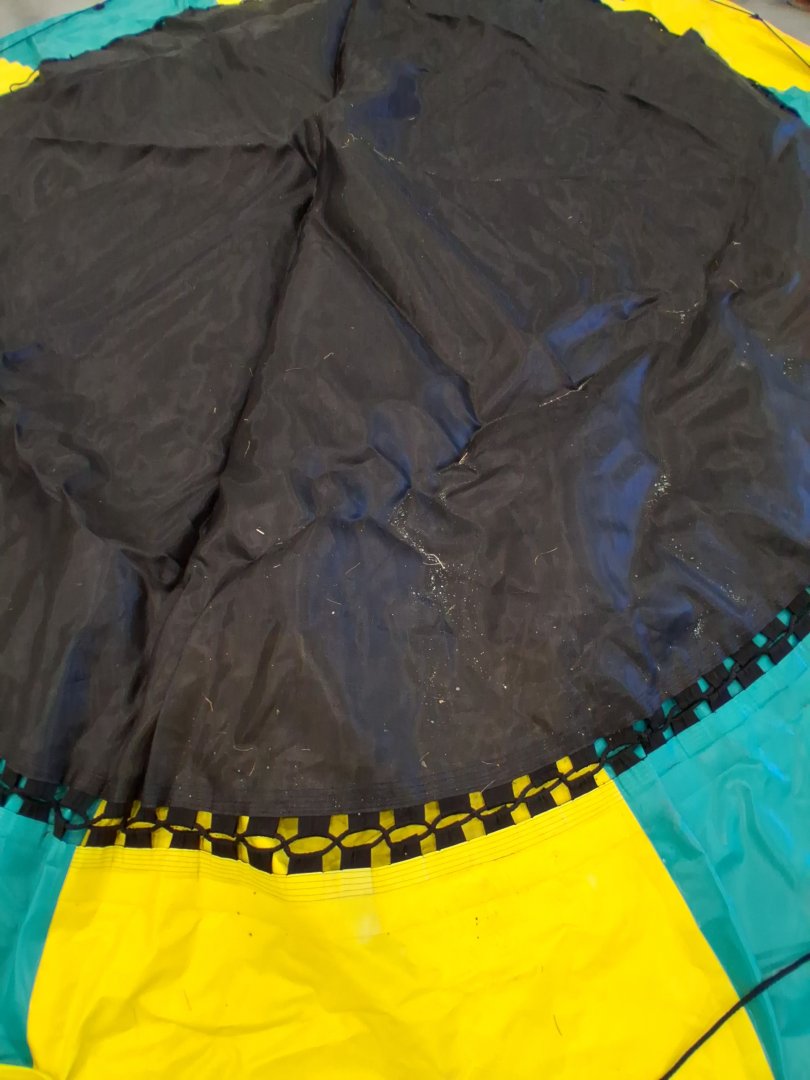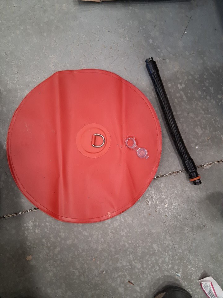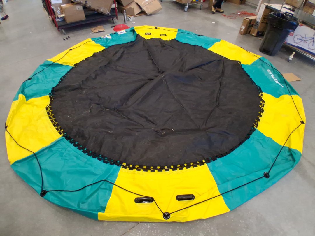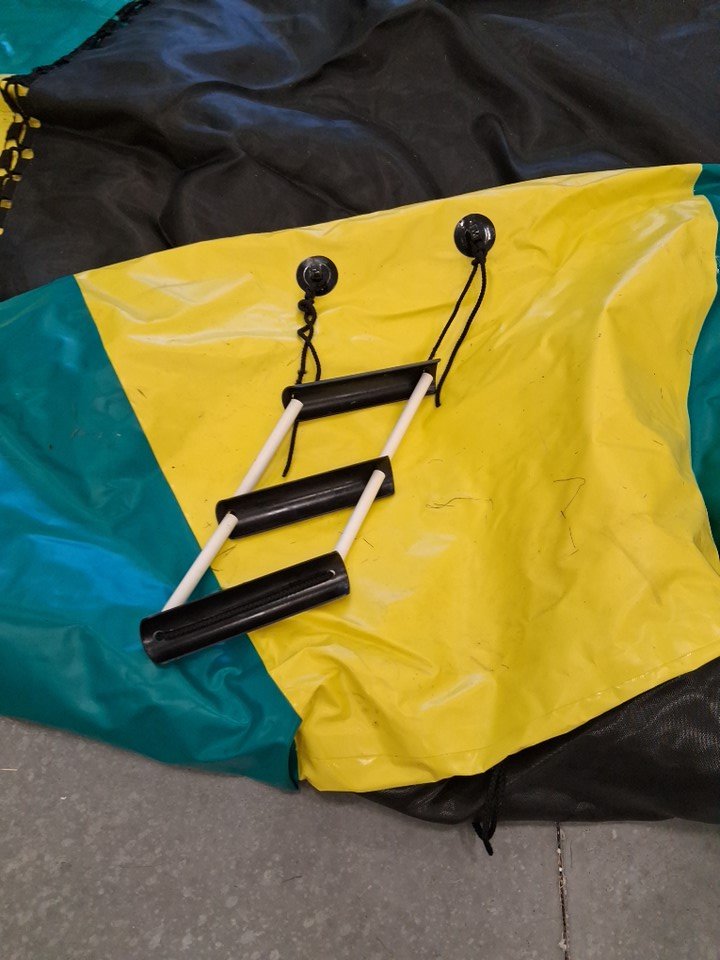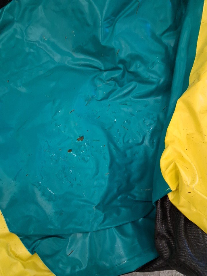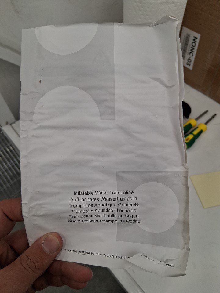 There is some sand and dirt left on the surface of the trampoline, and some moisture and debris left on the underside indicating previous use - see photos. Additionally, the air pump is missing from the package, though the hose and caps are present. Otherwise, the trampoline appears in good condition.