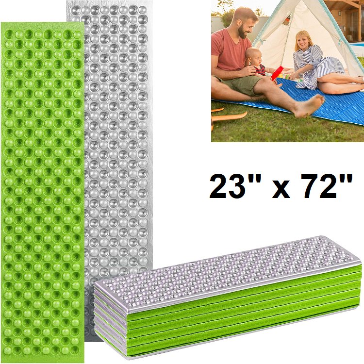 foldable waterproof lightweight double-sided closed cell foam sleeping pad for backpacking/hiking/picnics and more - 23" x 72" - silver/green