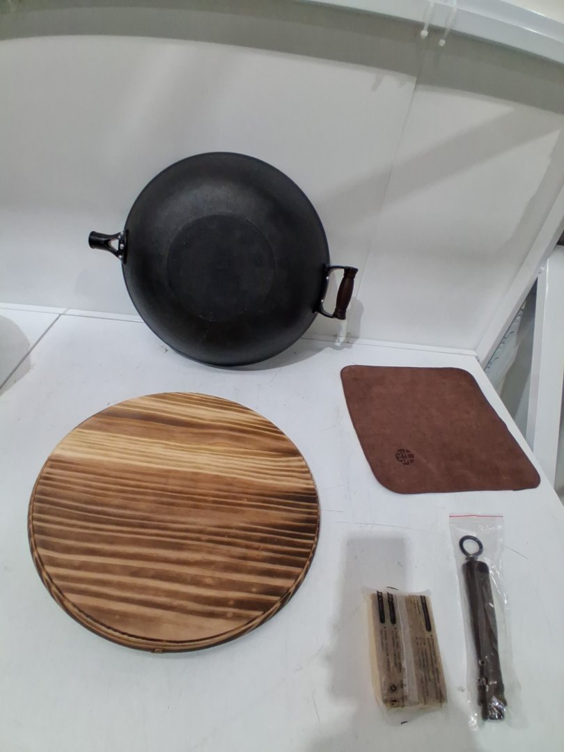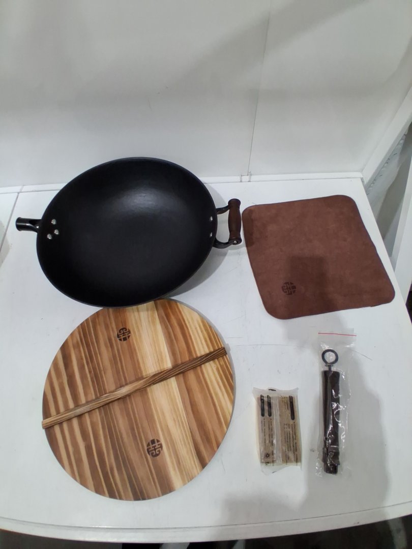 WANGYUANJI Cast Iron Wok Pan flat bottom with lid - 14.2" - ‎black/brown/wood grain