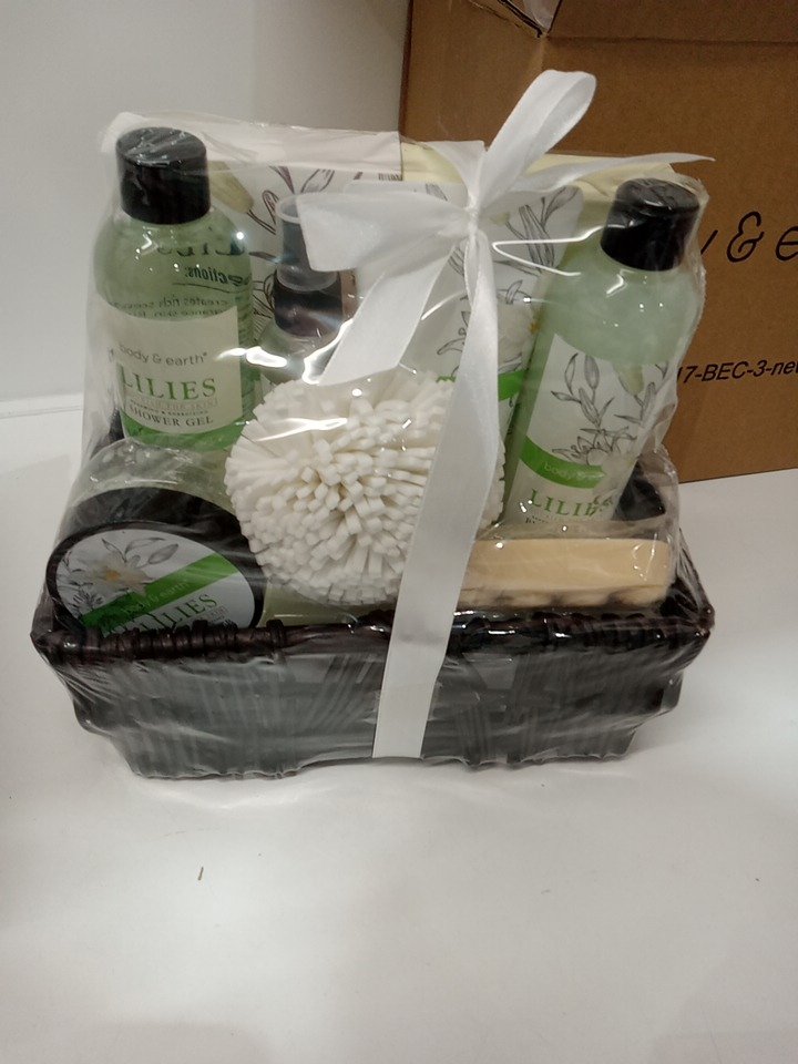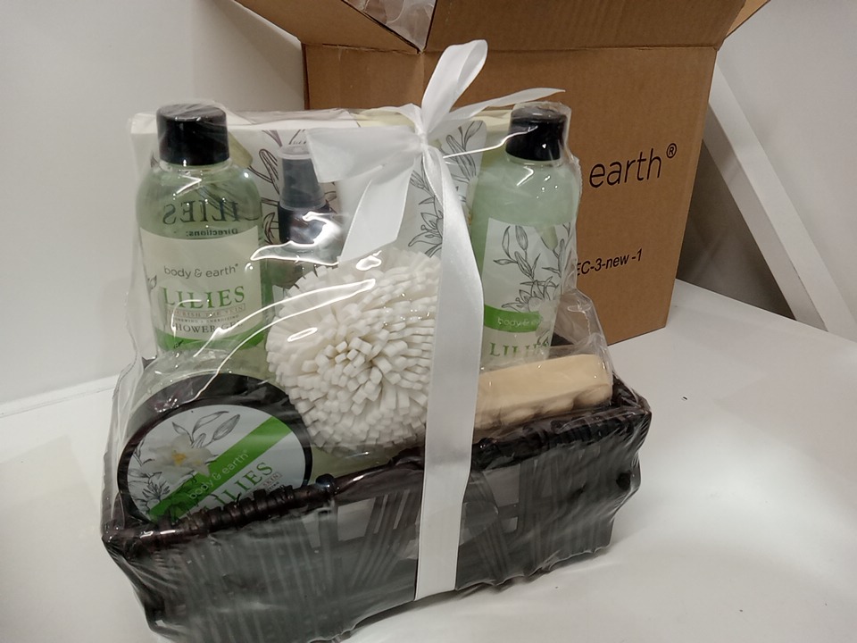 10PC BODY & EARTH LILIES SPA BATH BASKET GIFT SET - POTPOURRI, BATH SALT, BUBBLE BATH, SHOWER GEL, BODY MIST, BODY LOTION, BODY SCRUB, BATH PUFF, SOAP, AND BASKET - ASSORTED SIZES
