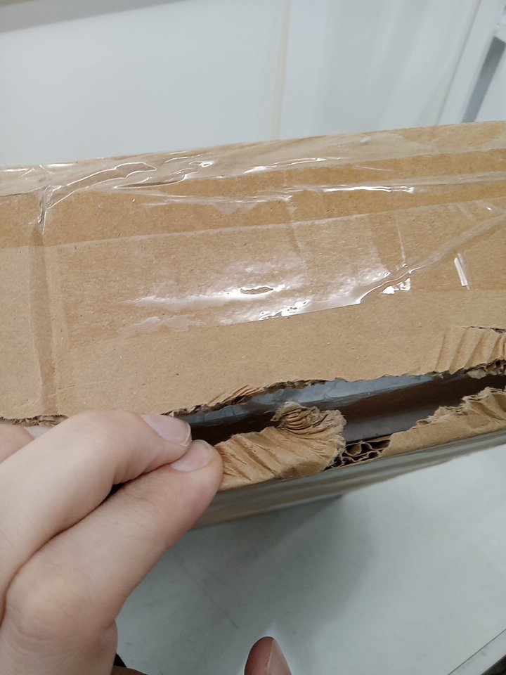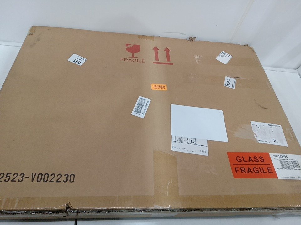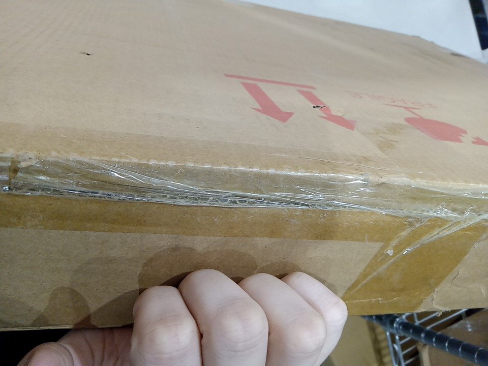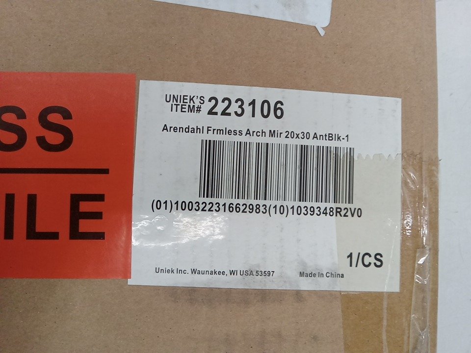 Box is ripped in one spot along the top but mirror is packed with Styrofoam and no loose glass can be heard from inside the box, suggesting it is still intact.