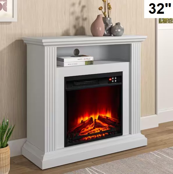 Winston Porter Freestanding Electric Fireplace with Realistic LED Flame Effects, 1,500 W Adjustable Heater, Multi-Level Flame Intensity, Built-In Timer, Remote Control and Wood-Grain Textured Housing - 32" - White (Model: FFP23340)