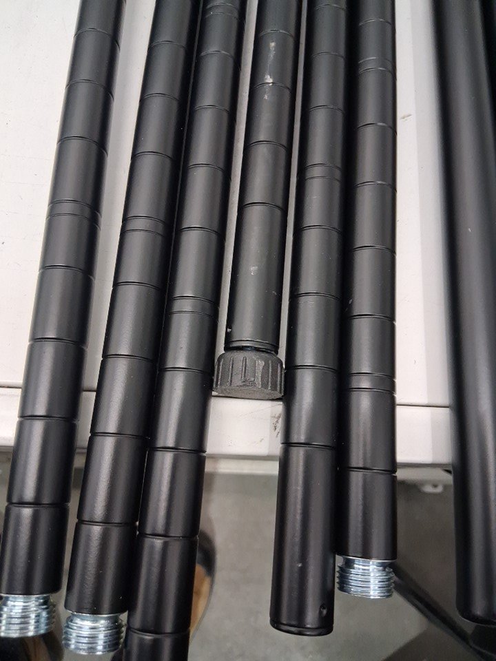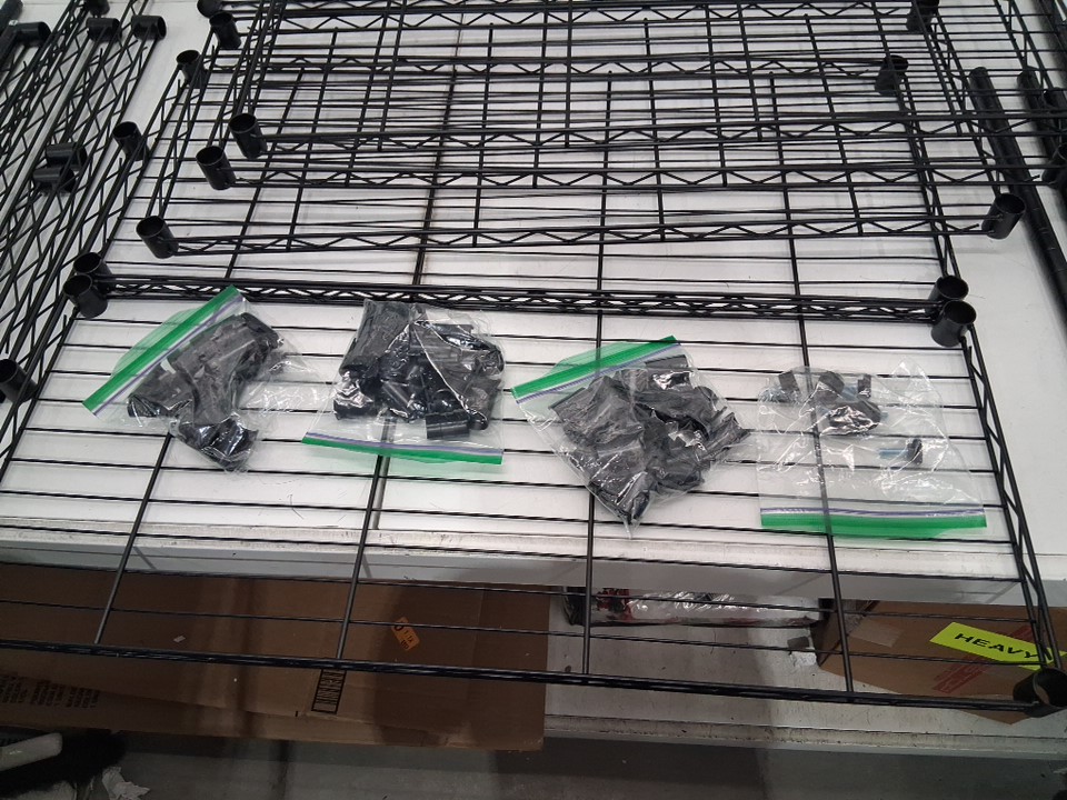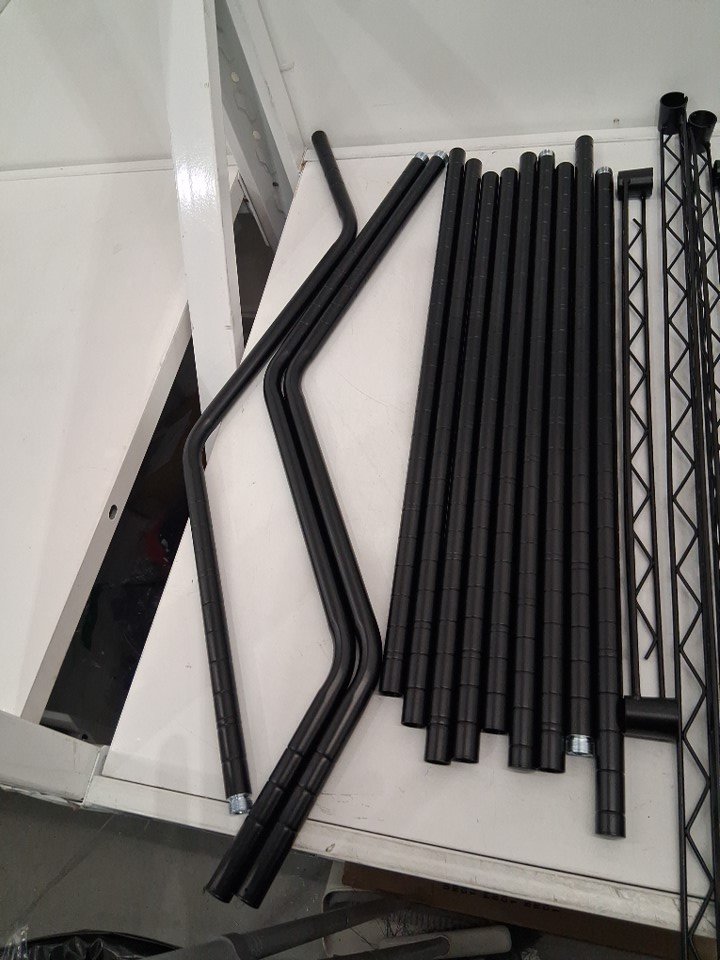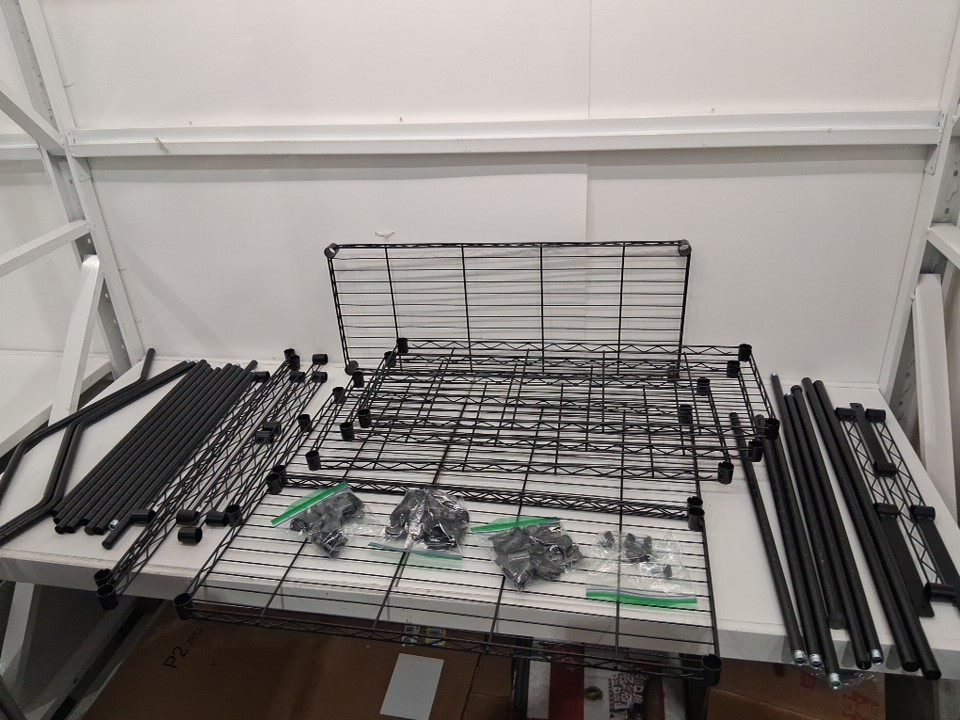Storage rack has been previously assembled some feet bottoms are attached and some pieces have scratches on paint