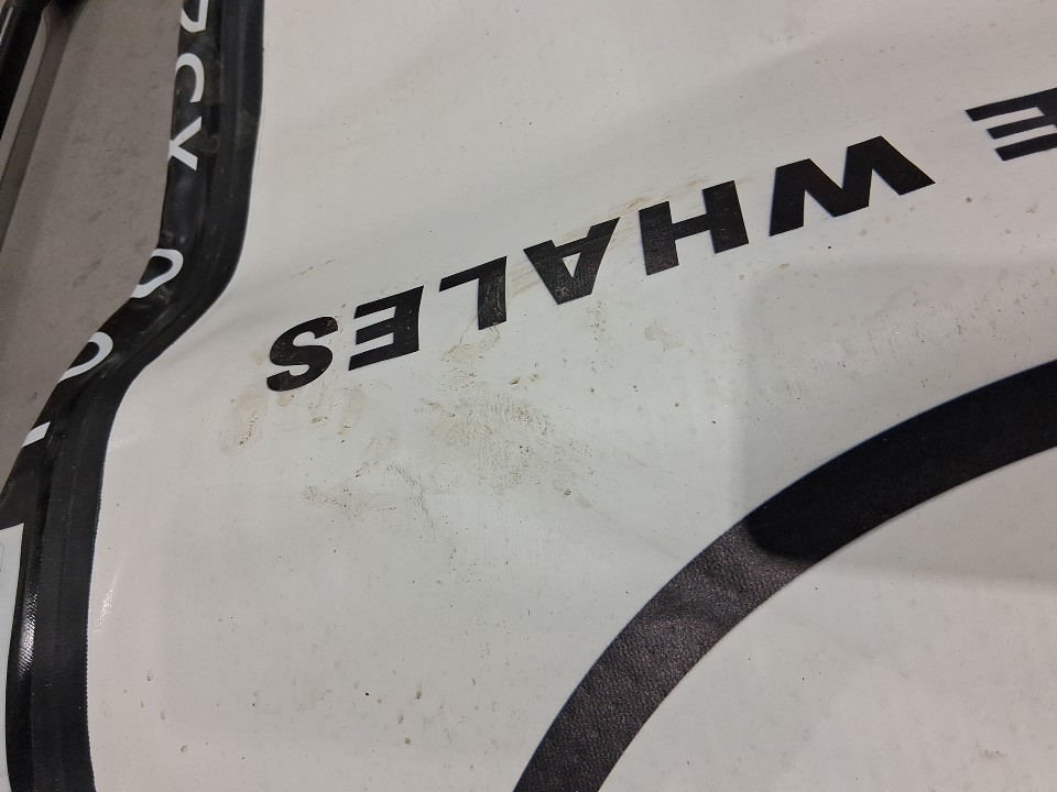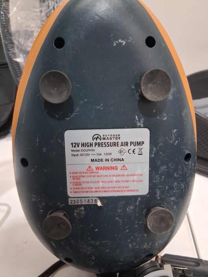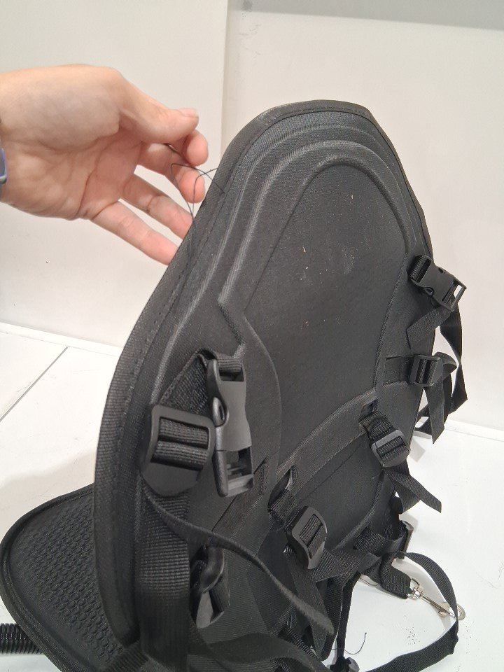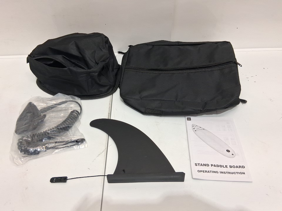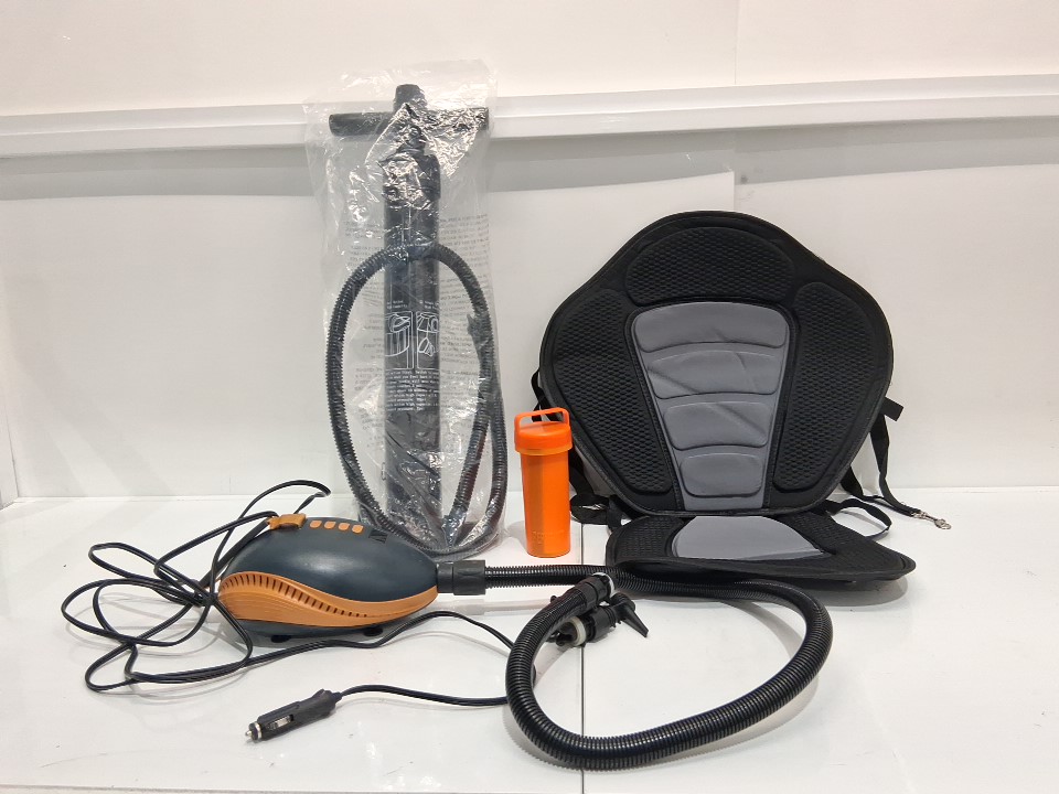 Dirt/dust from previous use on board. Some threading loose on top paddle seat, small holes on bag and dirt/dust. Scuffs on bottom of air pump. See photos