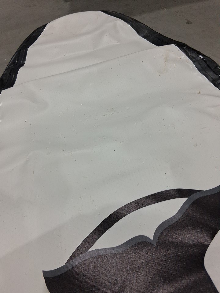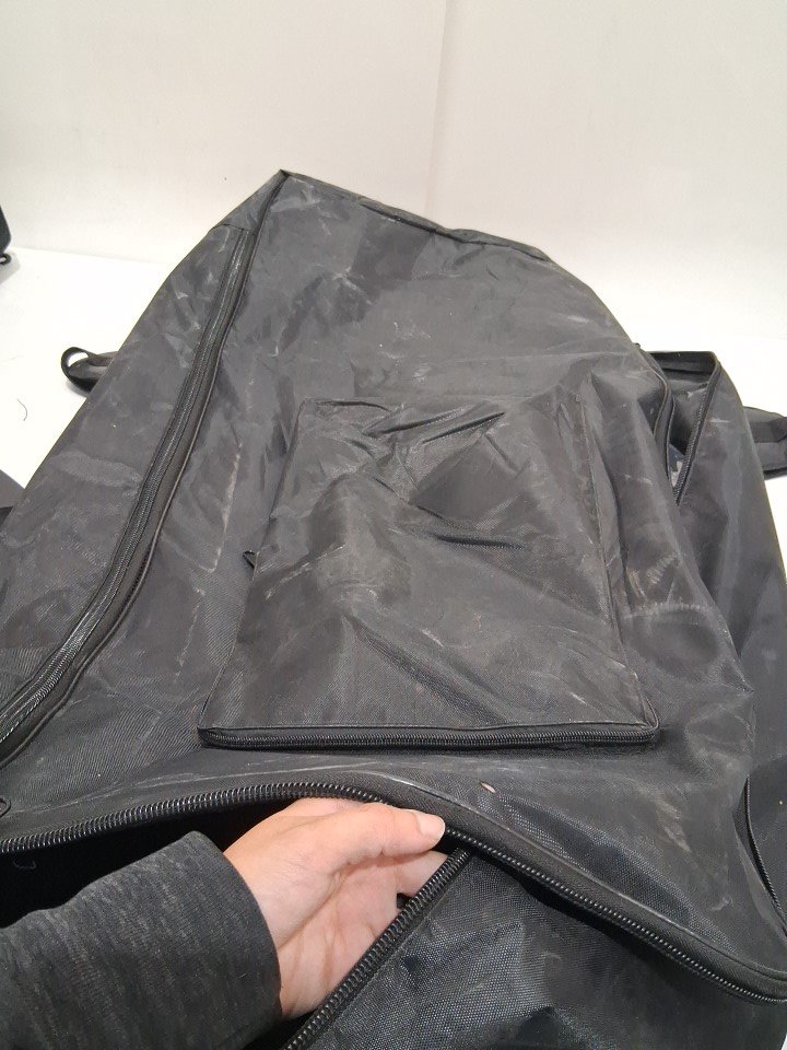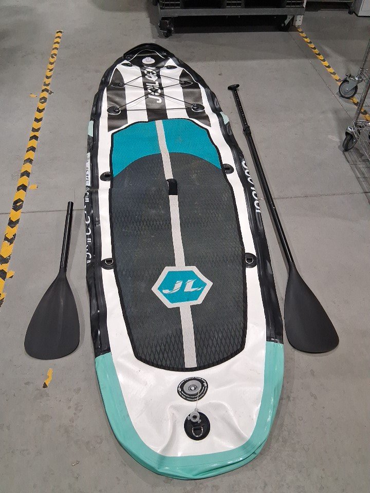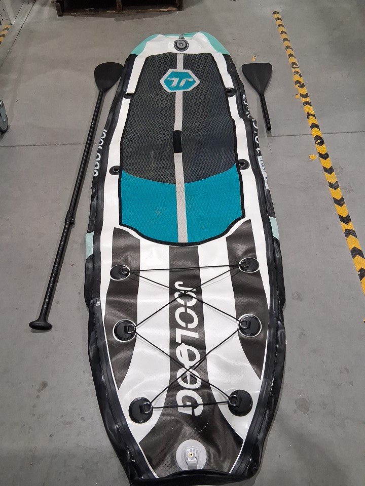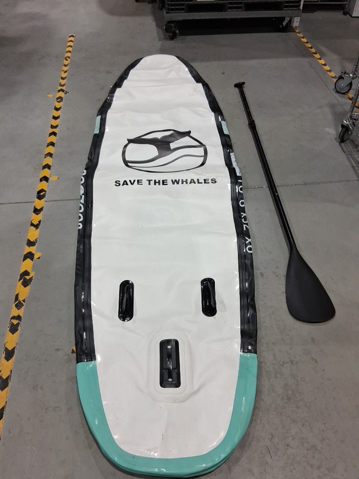 Dirt/dust from previous use on board. Some threading loose on top paddle seat, small holes on bag and dirt/dust. Scuffs on bottom of air pump. See photos