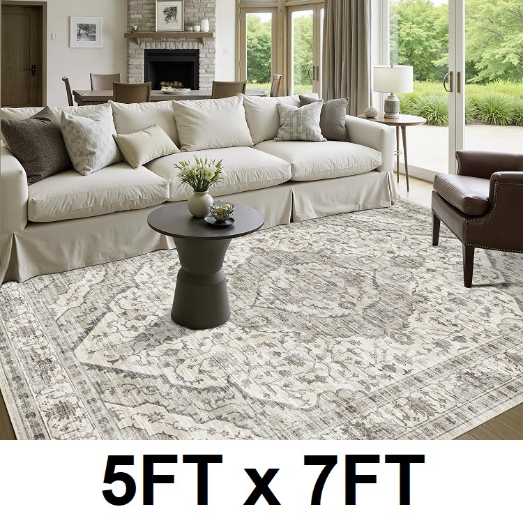 DEERLY vintage floral medallion boho non-slip washable area rug - 5ft x 7ft - border cream (model: ‎DL-BK)