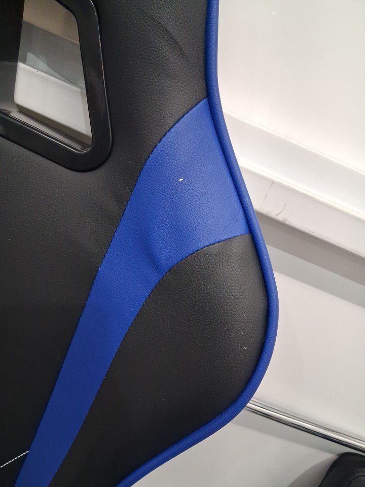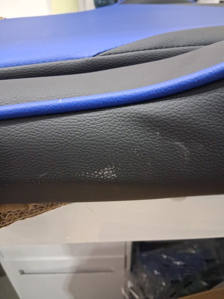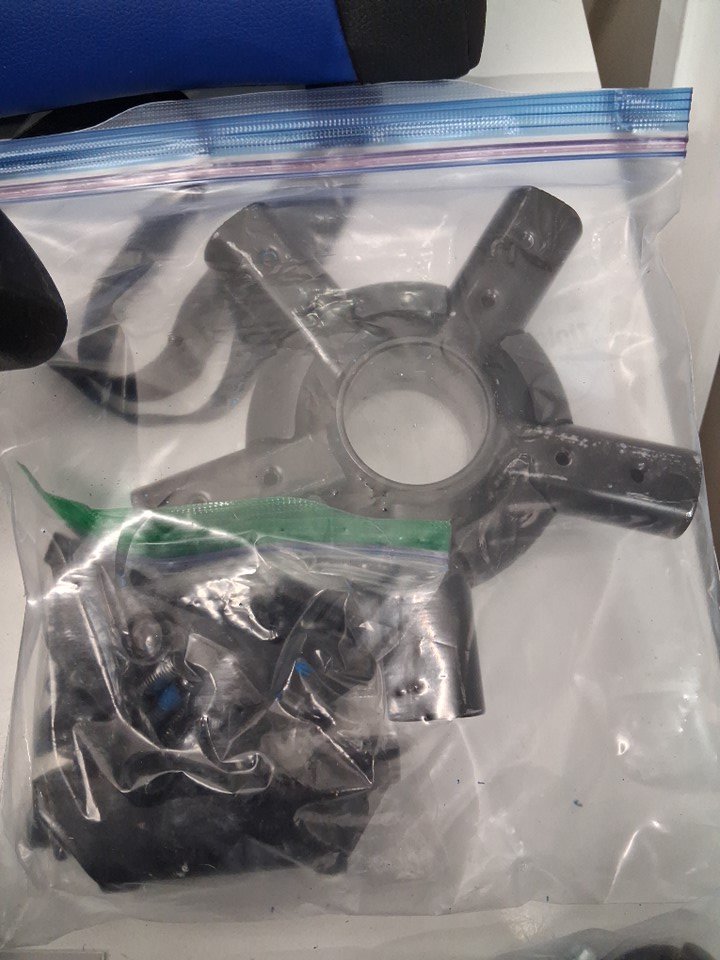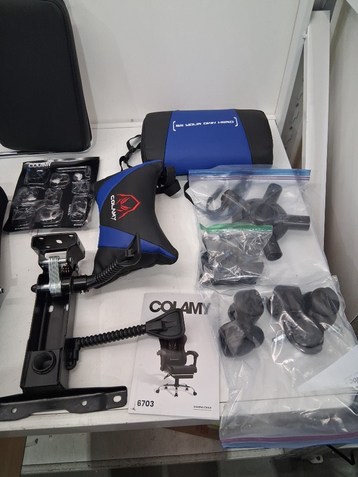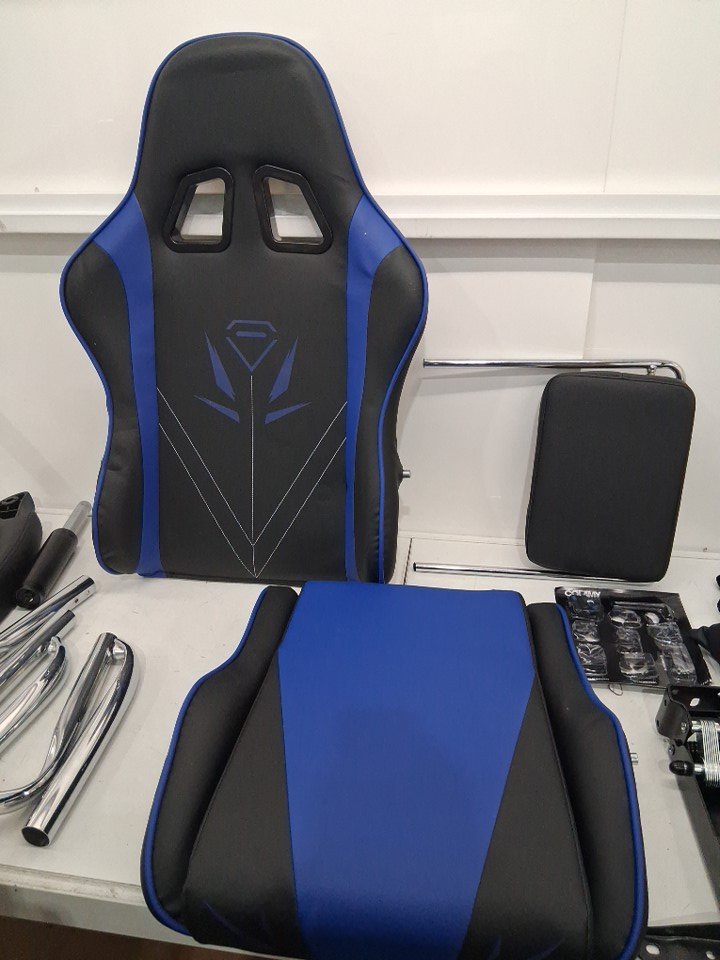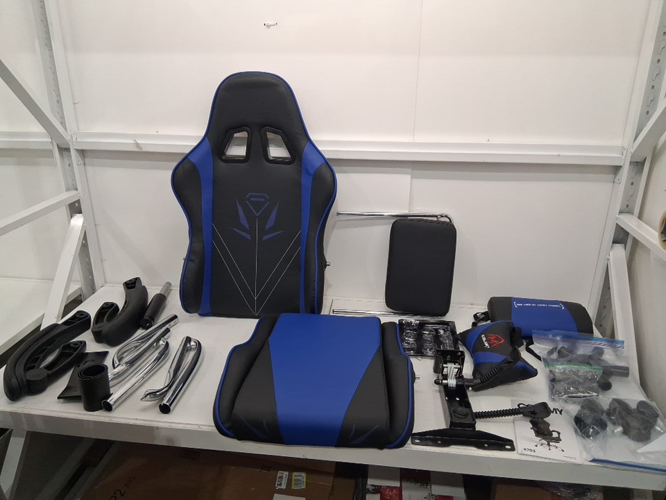 Chair has markings and tool blemishes from previous assembly. Hardware is in ziploc bags. Seat, back and headrest have small stains/ scuff marks on them