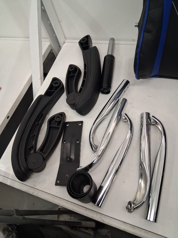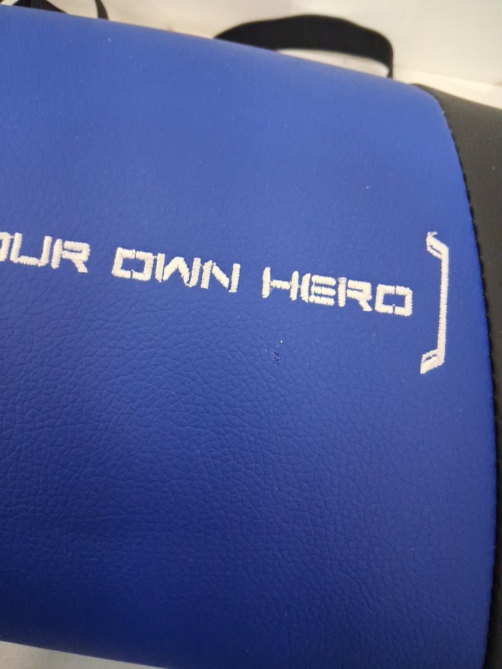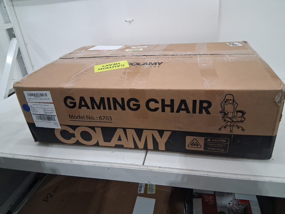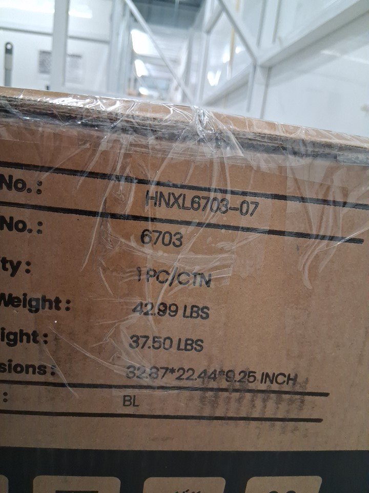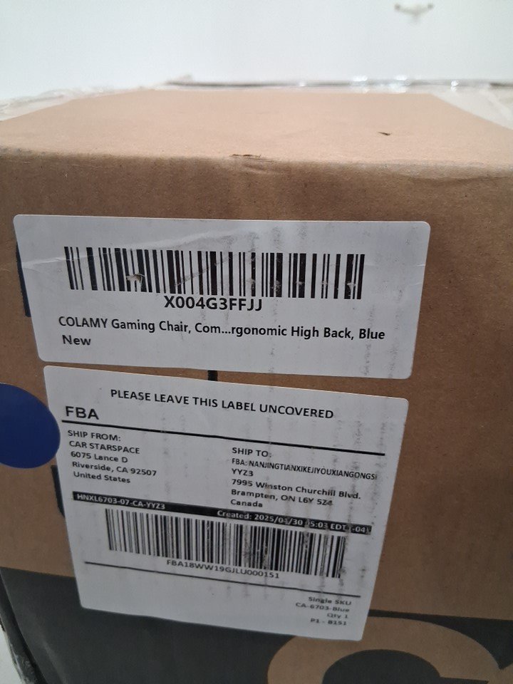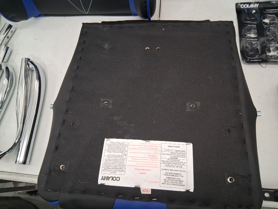 Chair has markings and tool blemishes from previous assembly. Hardware is in ziploc bags. Seat, back and headrest have small stains/ scuff marks on them