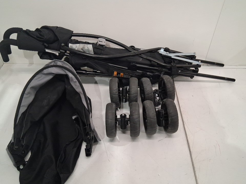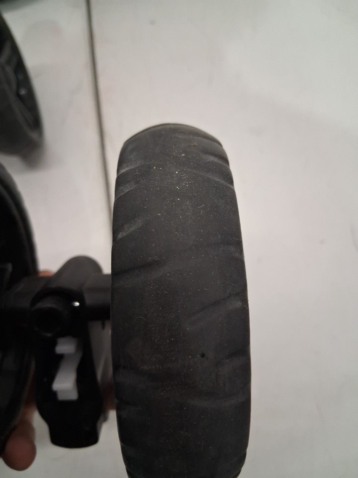 Scuff marks on wheel and cover, handle on stroller is cracked