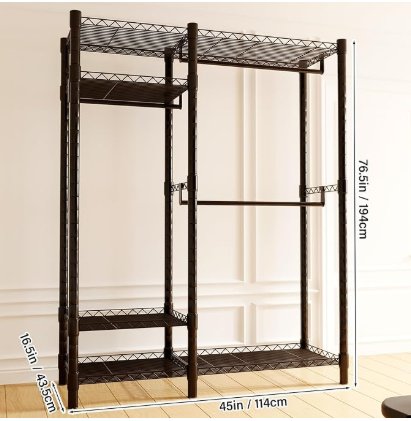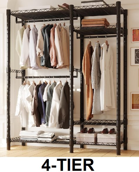 asdjakzp heavy duty 4-Tiers Adjustable Wire Shelving Clothes Rack with 3 Hanging Rods and Shelves - black (model: ‎0Z01-623-Q4R2)