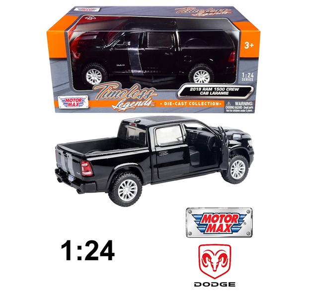 motormax 2019 Laramie Crew Cab dodge ram 1500 rolling wheels and front doors open - 1:24 scale - black (model: 79357)