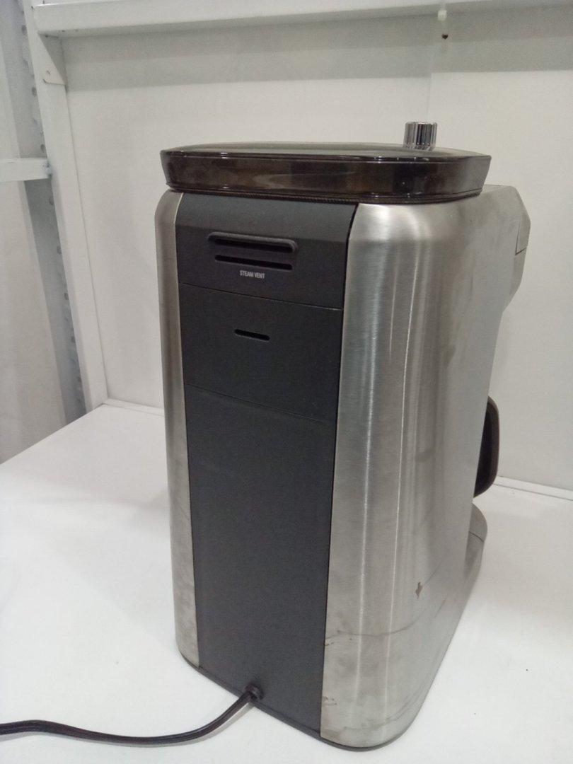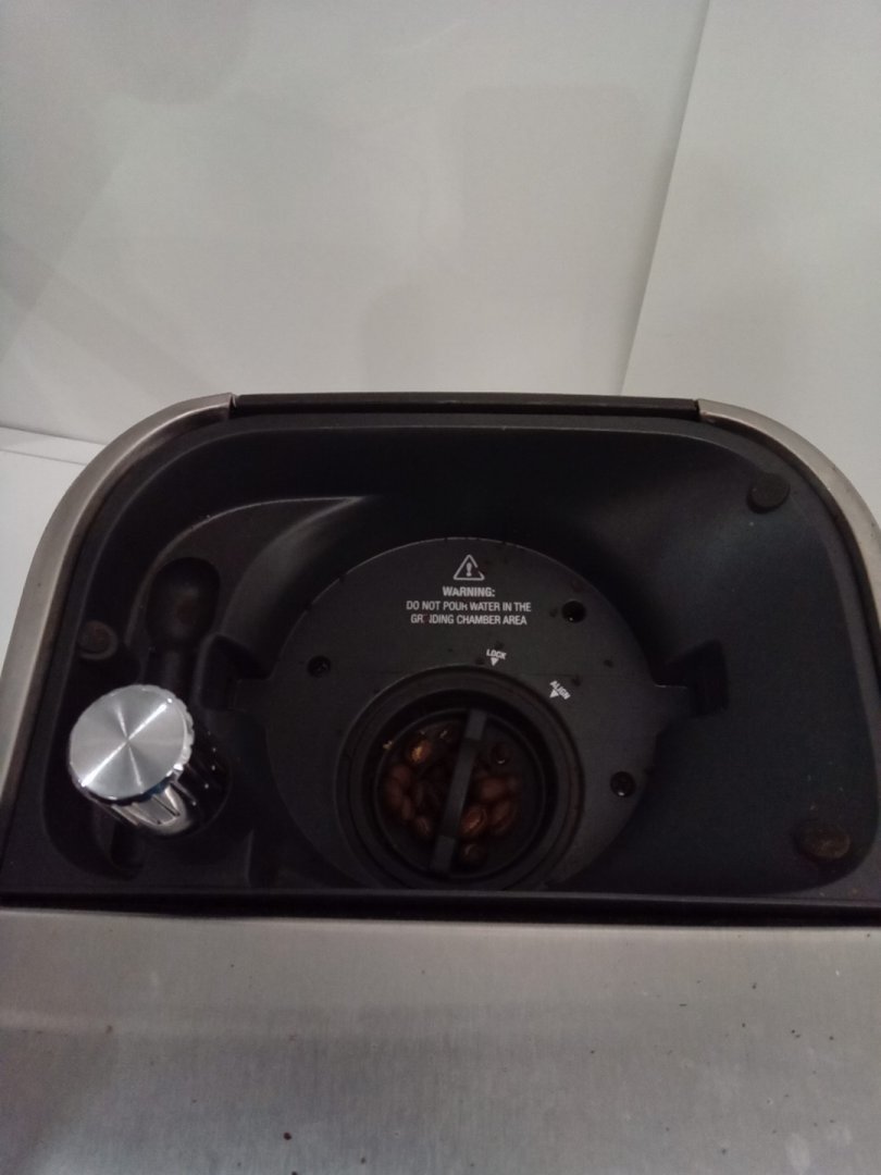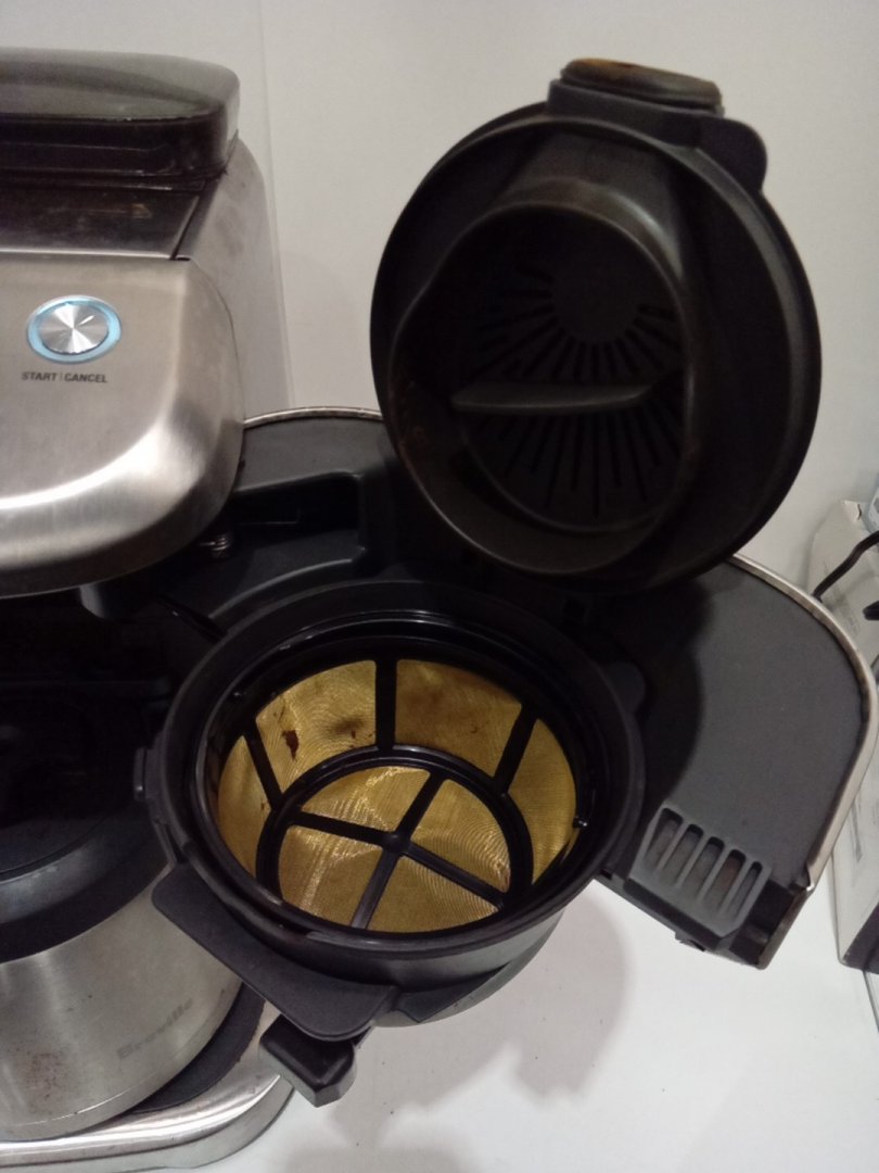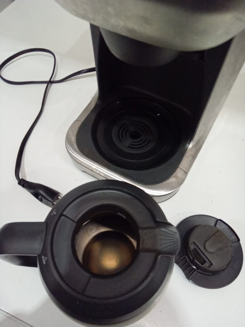 Coffee stains, residual beans and grinds from prior use. Tested for basic power only.