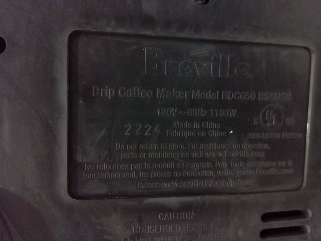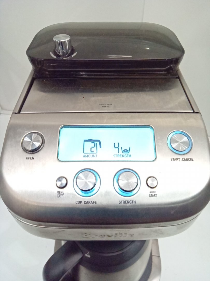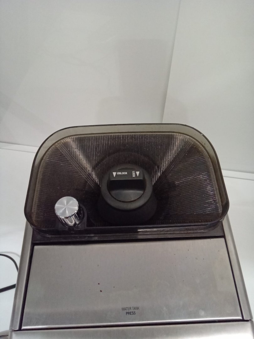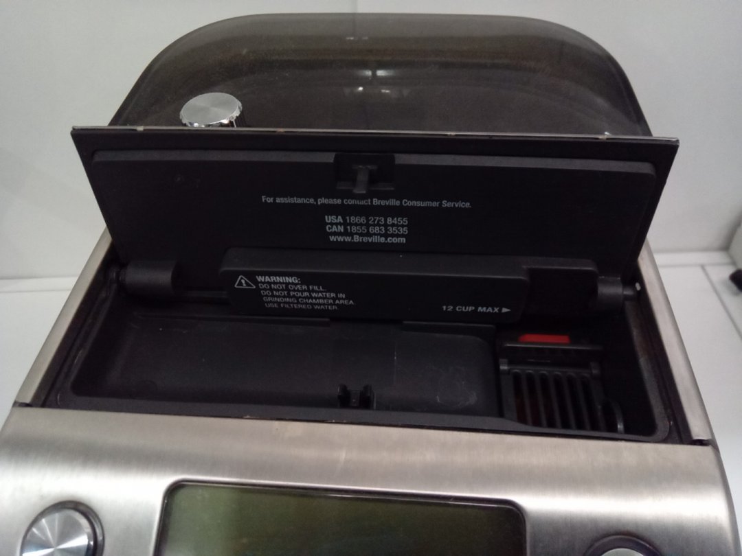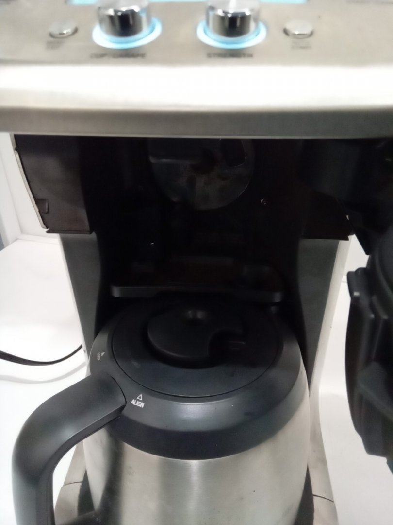 Coffee stains, residual beans and grinds from prior use. Tested for basic power only.